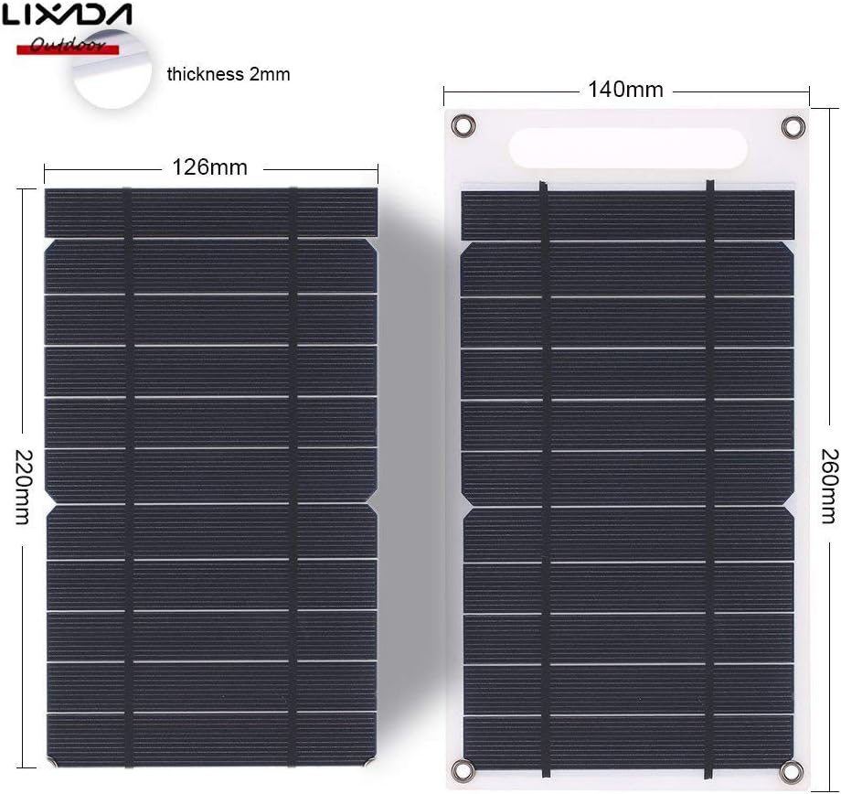 Solar panel output: 6V 1300mAUSB version: 2.0USB output: 5V 1000mAWater resistance: IP65Solar panel size: 22 * 12.6cm / 8.7 * 5in (L * W)Item size: 26 * 14 * 0.2cm / 10.2 * 5.5 * 0.1in (L * W * H)Item weight: 127g / 4.5 ozPackage size: 28.5 * 16 * 2cm / 11.2 * 6.3 * 0.8in (L * W * H)Total weight: 179g / 6.3oz Package list: