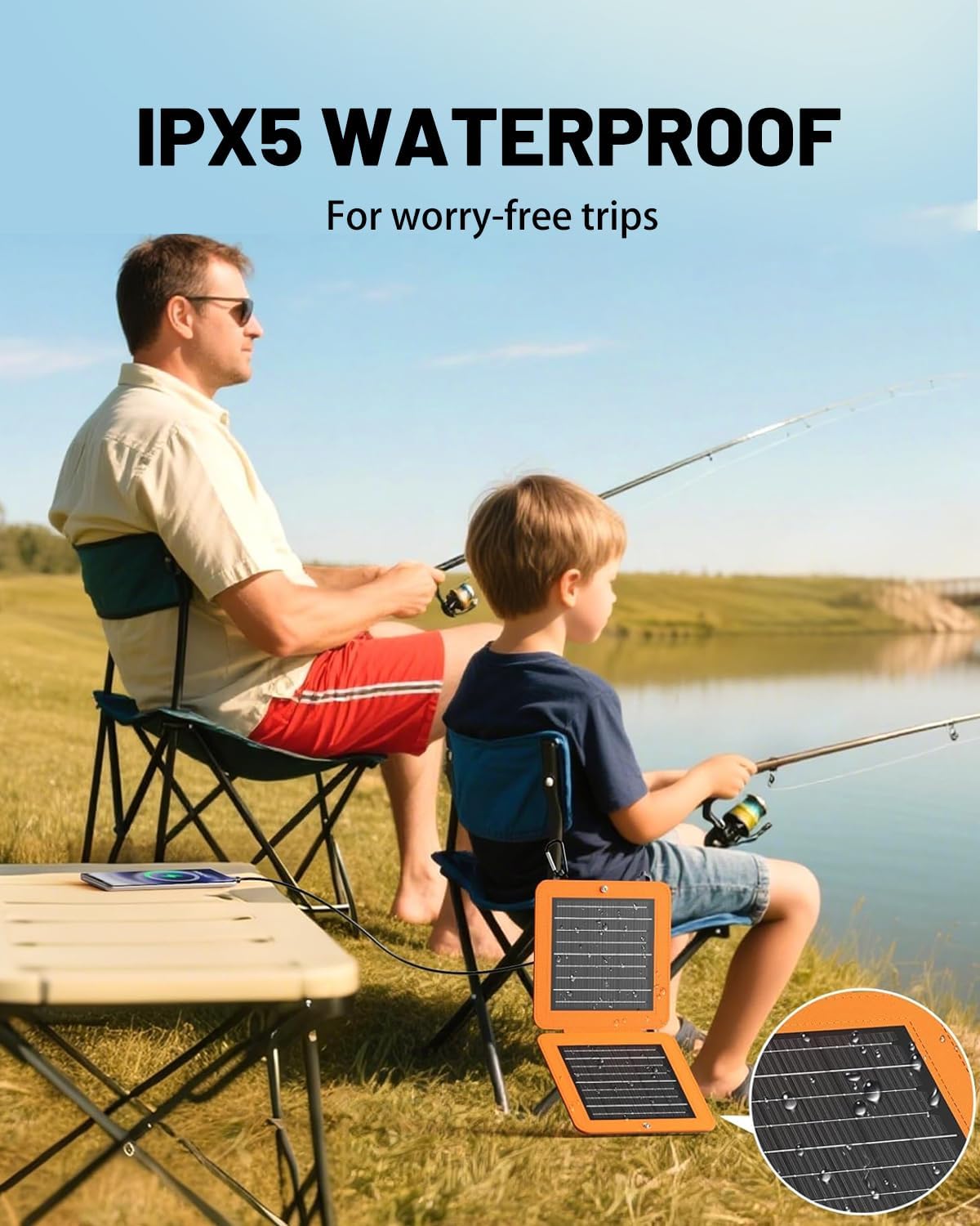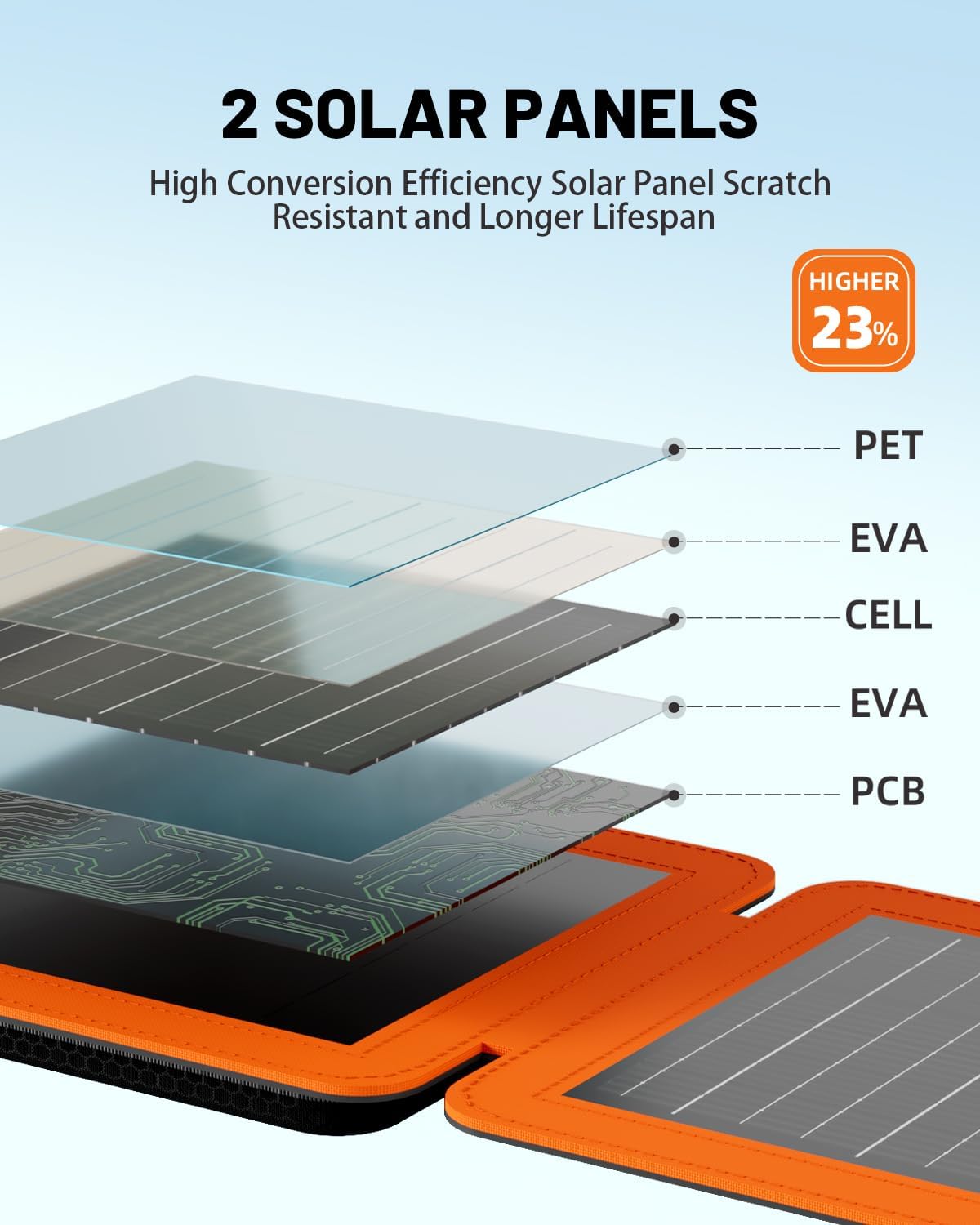 10W Solar Panels:SOLUPUP solar panels utilize multi-layer cell technology to capture energy from the sun and achieve a high energy conversion efficiency of 23%. The built-in smart chip can intelligently identify your device and maximize its charging speed while protecting your device from overcharging and overlo.
