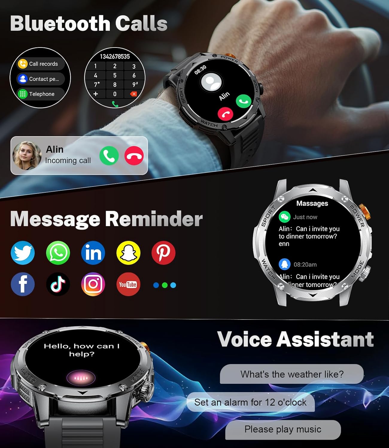 LIGE 2025 1.75” HD Display Miliary Smart Watches with 1000mAh Battery/Led Flashlight,Metal/Silicone Straps