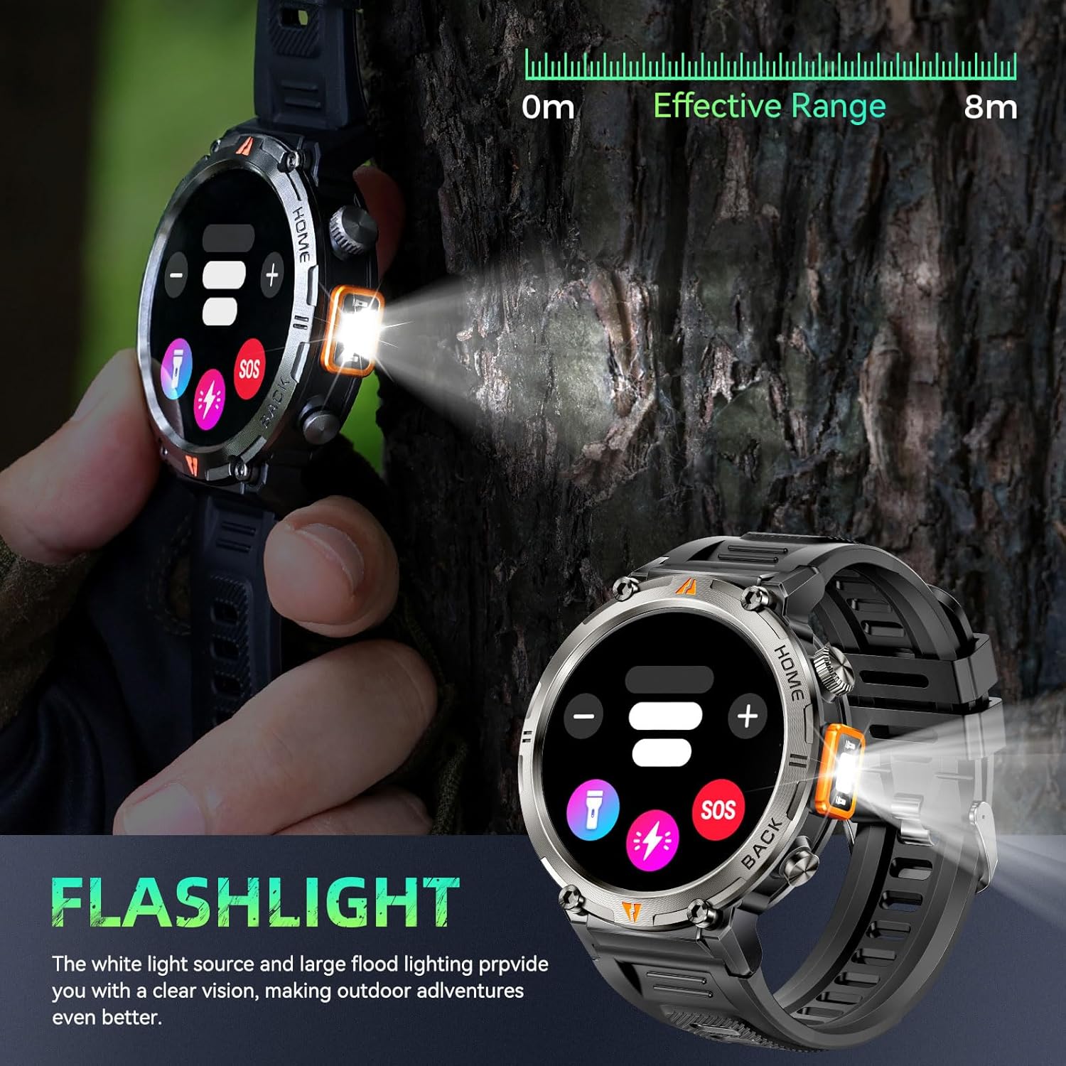 【Upgraded LED Flashlight & Compass】- LaNikar military smart watches for men are equipped with a high-brightness LED flashlight with three optional light modes: strong light mode, flash mode, and SOS mode. You can also manually adjust the three levels of brightness as needed, suitable for various scenarios. The tactical smart watches for men are also equipped with a compass function to help you easily navigate during outdoor activities. You can easily start any adventure, whether day or night.