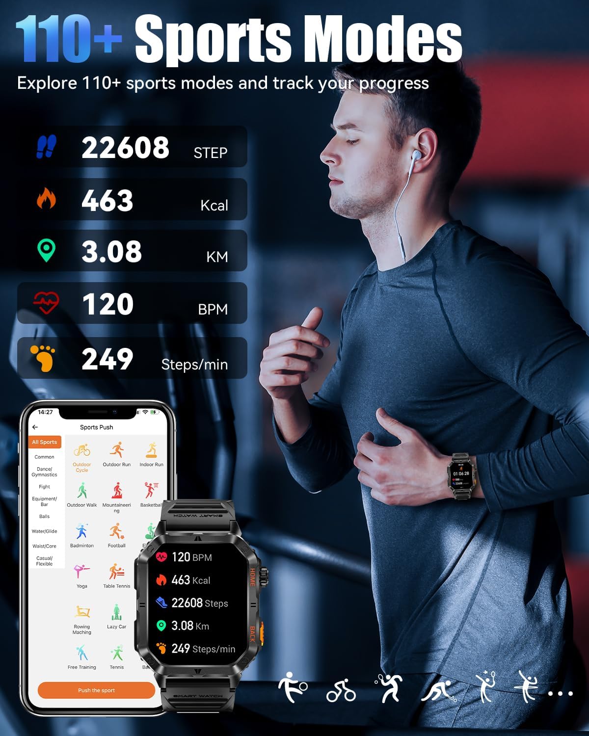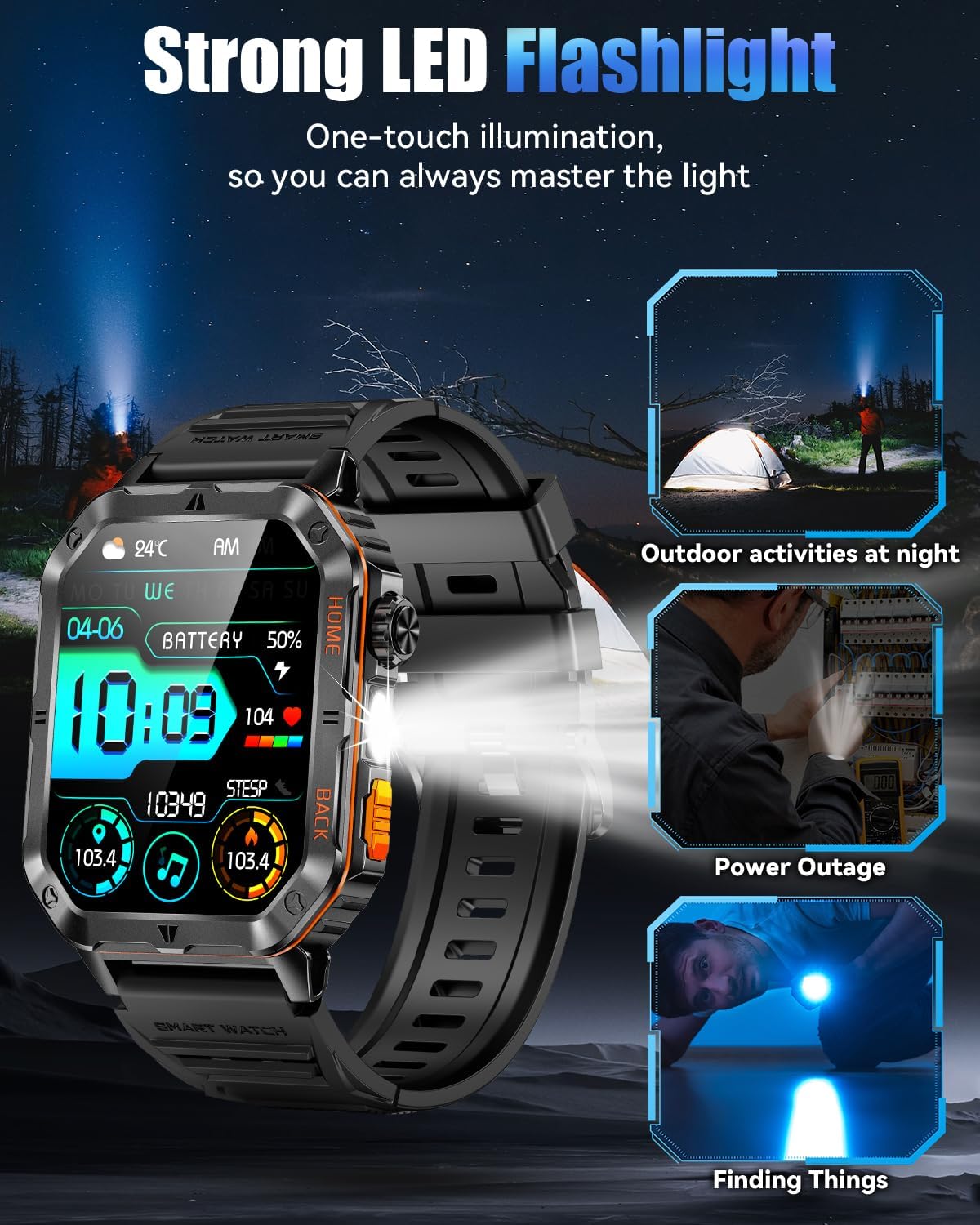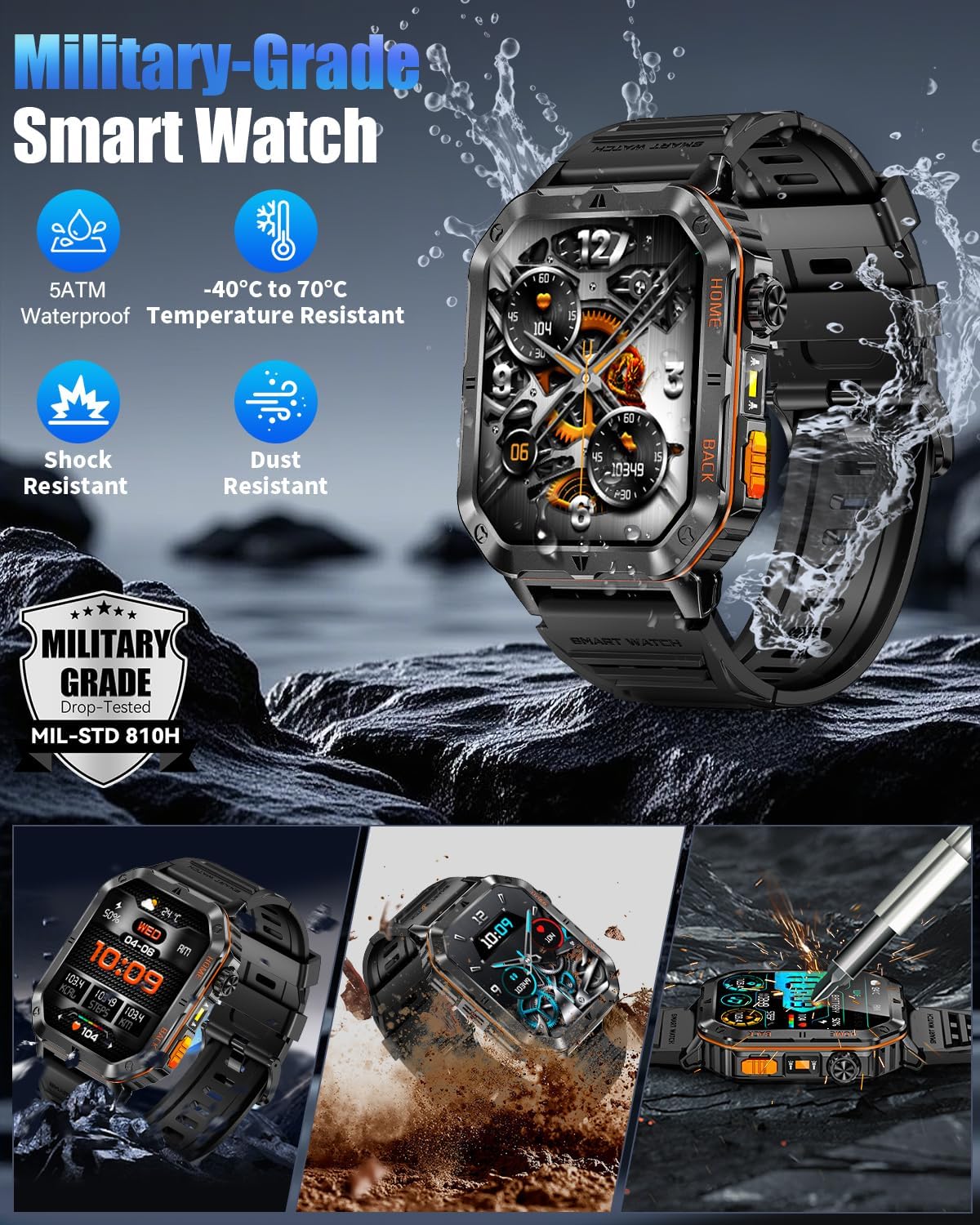 【Military-Grade Durability】This smartwatch for men has passed 12 rigorous military tests, including extreme temperature, dust, and salt spray resistance. Built to withstand water, shocks, and dust, This rugged smart watch a tough companion designed for your outdoor adventures.