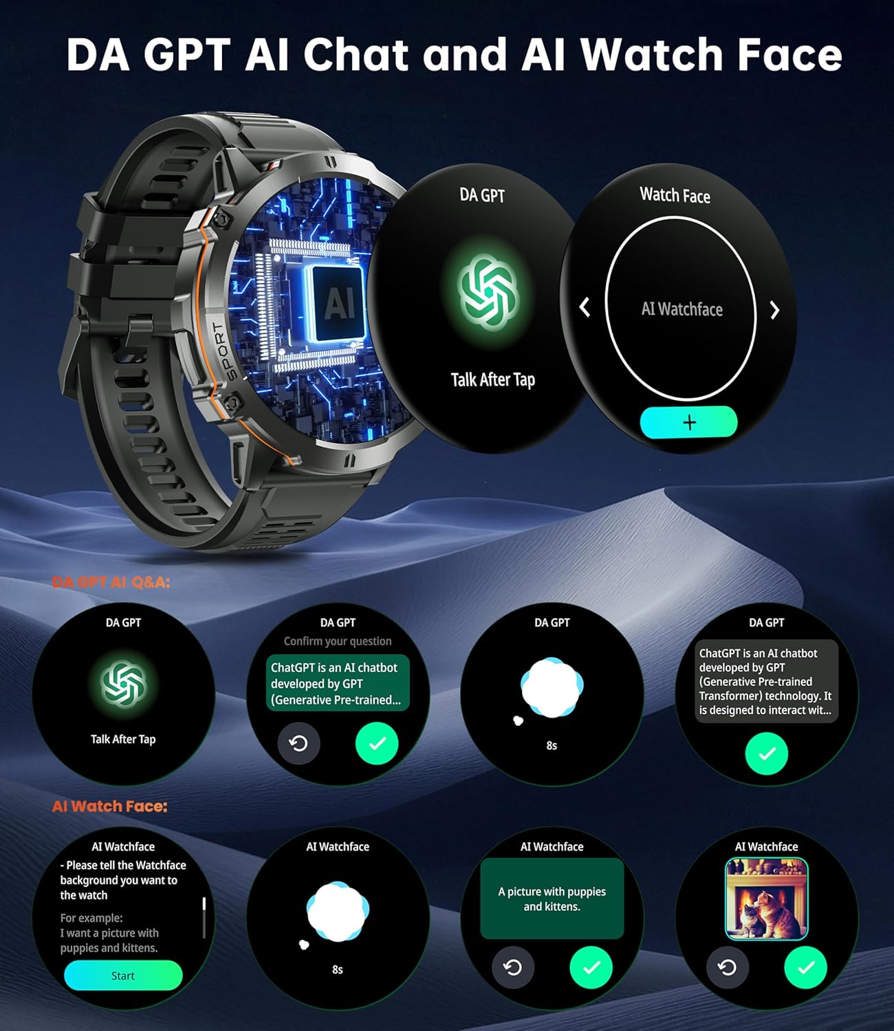 Integrated GPT voice chat and AI-powered customized watch face. Experience the future of technology with our integrated GPT voice chat! Ask questions, get real-time information or have natural conversations directly from your wrist. In addition, the AI-powered feature enables a fully customizable watch face – adapt the design to your mood, style or the weather. Your smartwatch, your rules!