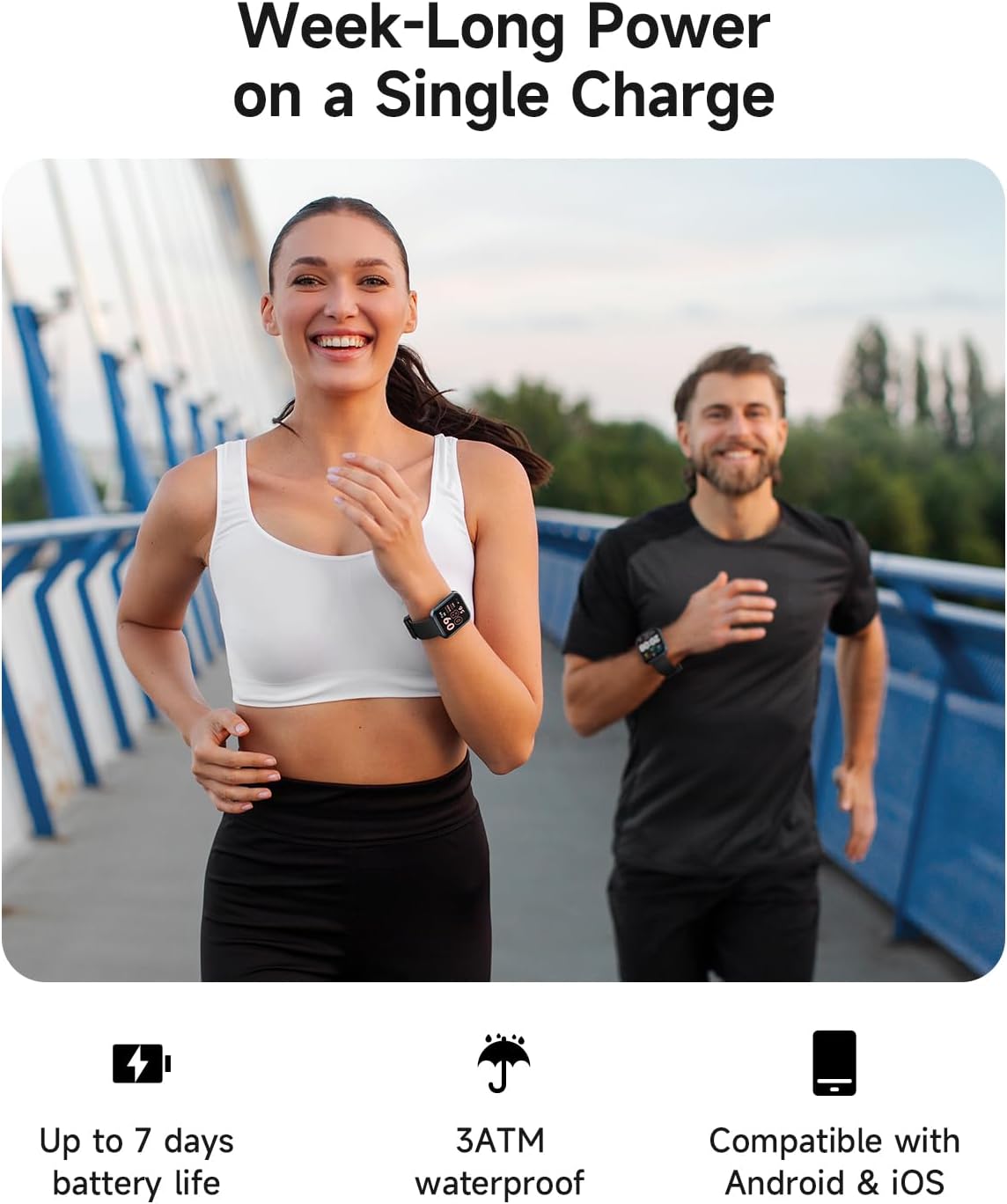 【7-Day Battery | iOS/Android Compatible】Work seamlessly with iPhone or Android phones. A single charge powers 7 days of use, with features like music control, weather alerts, and camera shutter—all at a glance.