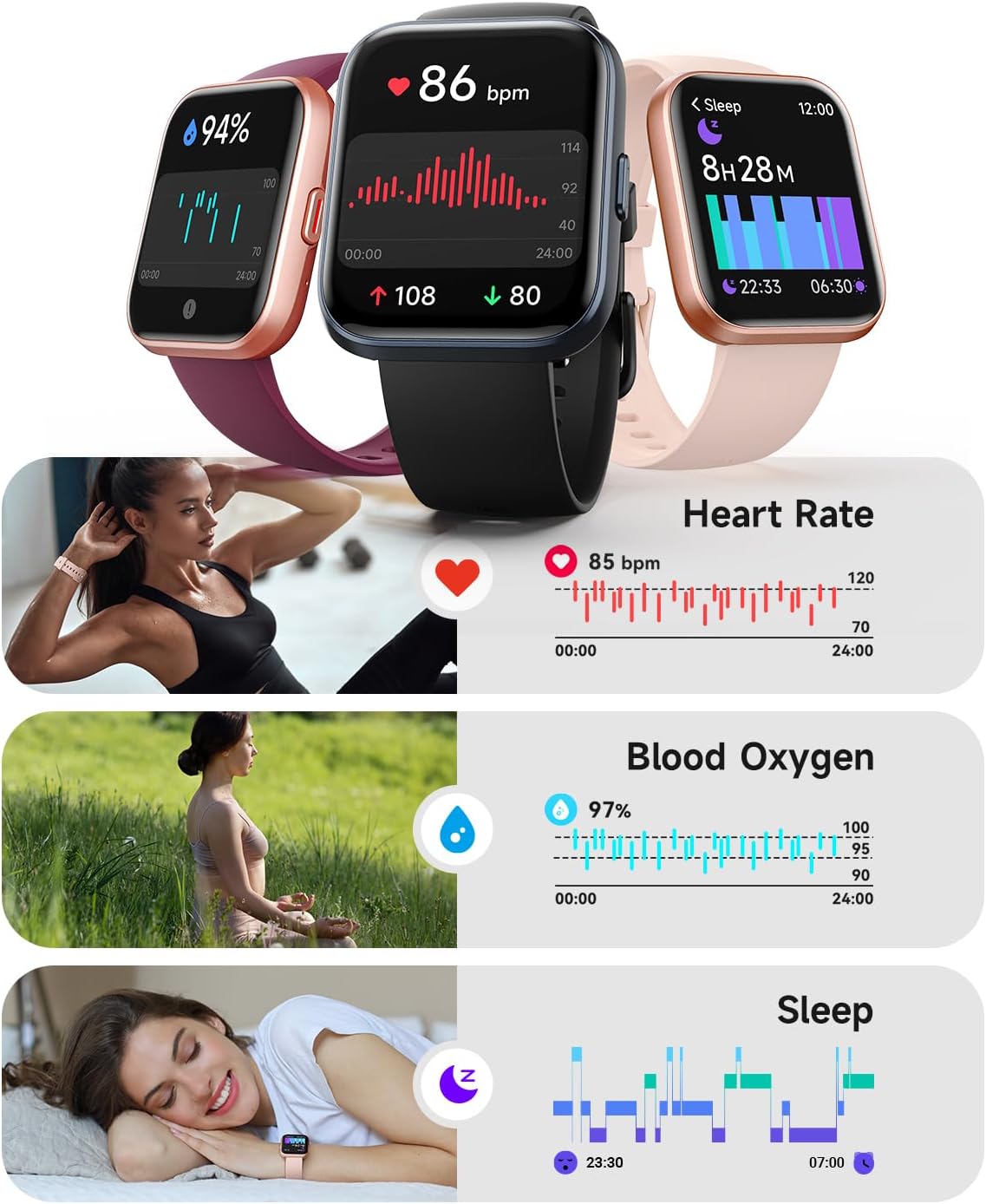 【Bluetooth 5.3 with DSP Chip】Enjoy crystal-clear calls and instant notifications on your wrist. Our advanced Bluetooth 5.3 and built-in DSP chip deliver zero-lag audio, so you never miss a conversation—even on the move. (Note: Supports notifications but not message replies.)