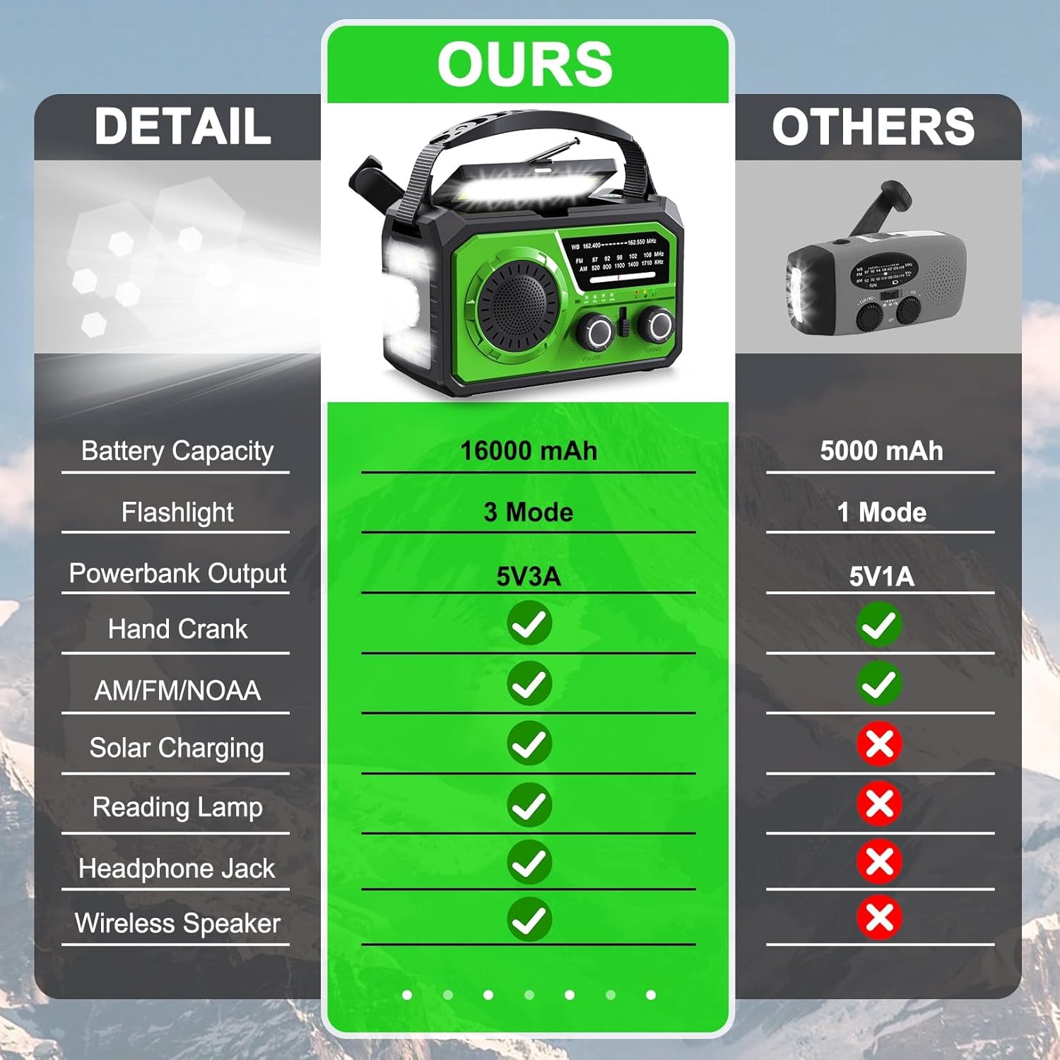 MORE POWER, TRUE PEACE OF MIND: Get the ultimate peace of mind with 33% more battery capacity than standard radios. Never settle for less when safety is on the line. With a massive 16000mAh industrial-grade lithium battery (33% larger than standard 12000mAh models), our emergency radio keeps your phones charged and family connected through multi-day blackouts. It’s not just a power bank; it’s your family’s lifeline during hurricanes, storms, or any crisis.