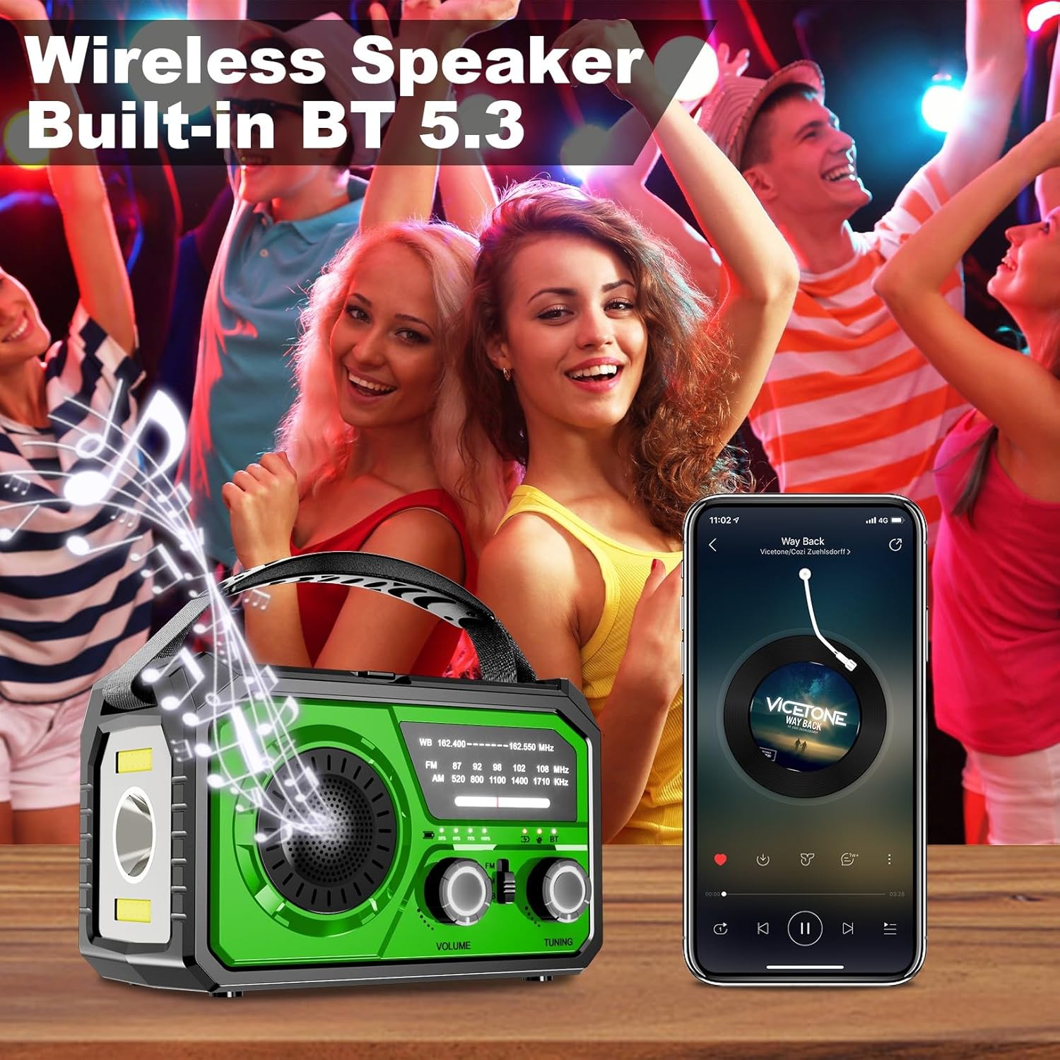 WIRELESS AUDIO FREEDOM with Latest Bluetooth 5.3 Stream your survival podcasts or boost campfire morale with crystal-clear, static-free sound. Our advanced Bluetooth 5.3 ensures a rock-solid connection and lower power consumption. One simple switch transforms this NOAA radio into a powerful outdoor speaker—no complicated pairing, just pure, reliable entertainment.