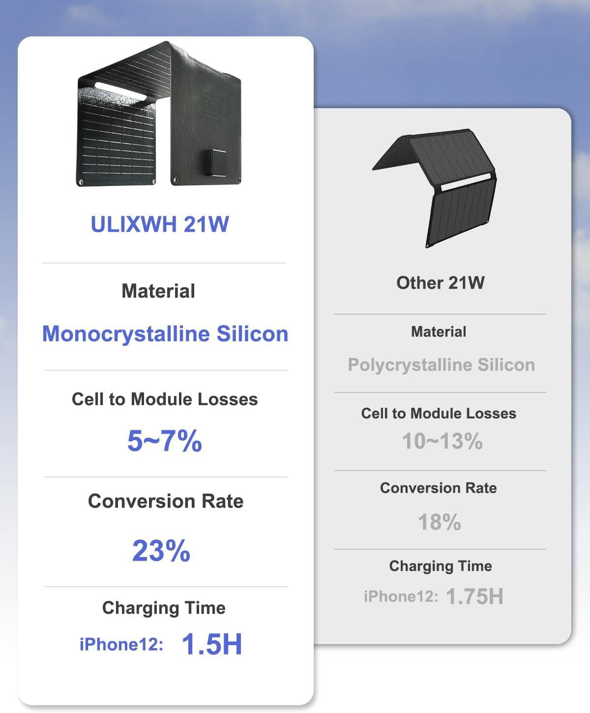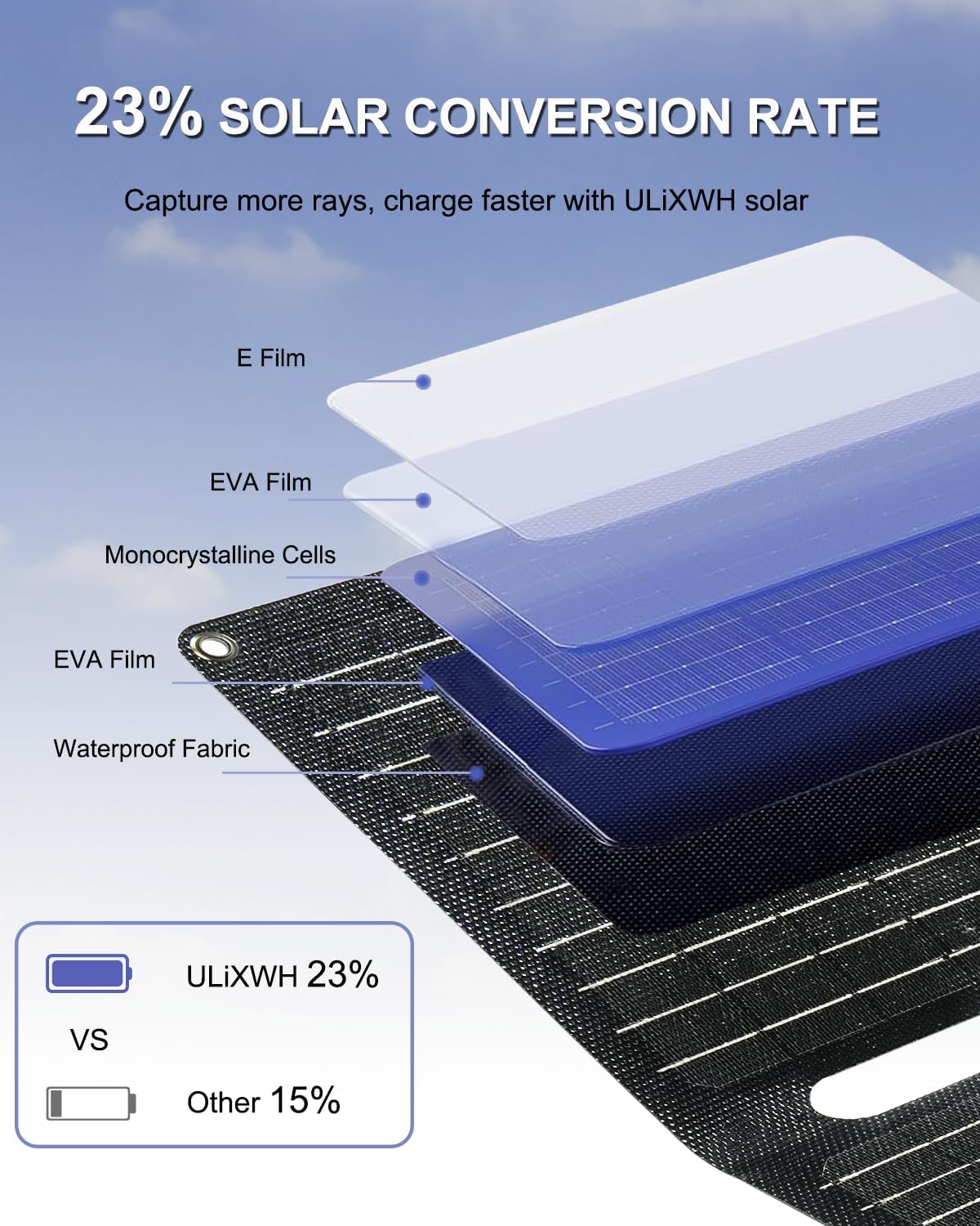 SUPER-FAST CHARGING AND SAFETY: The ULiXWH solar phone charger features dual USB ports (5V/3A) for efficient charging of multiple devices. Its advanced Battery Management System (BMS) boosts charging speed by up to 30% and includes built-in safeguards to protect against overcharging and overloading
