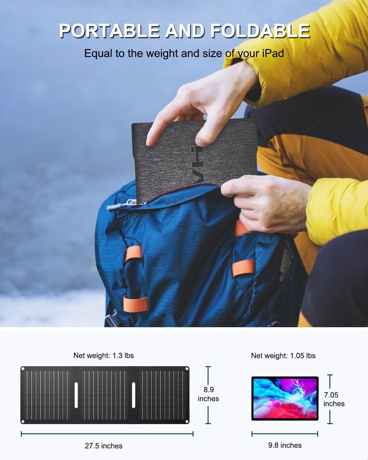 HIGHER EFFICIENCY: The foldable solar panel charger utilizes monocrystalline silicon material to achieve a conversion efficiency of up to 23%, higher than conventional panels, ensuring reliable and efficient power generation when you need it most