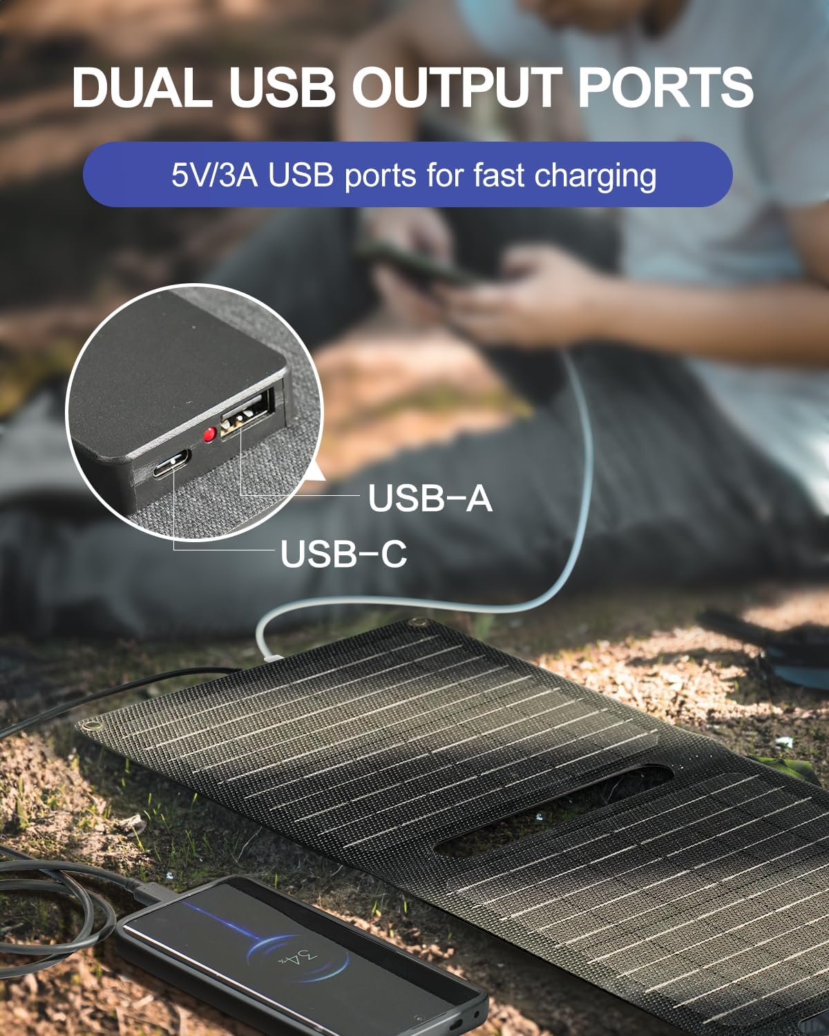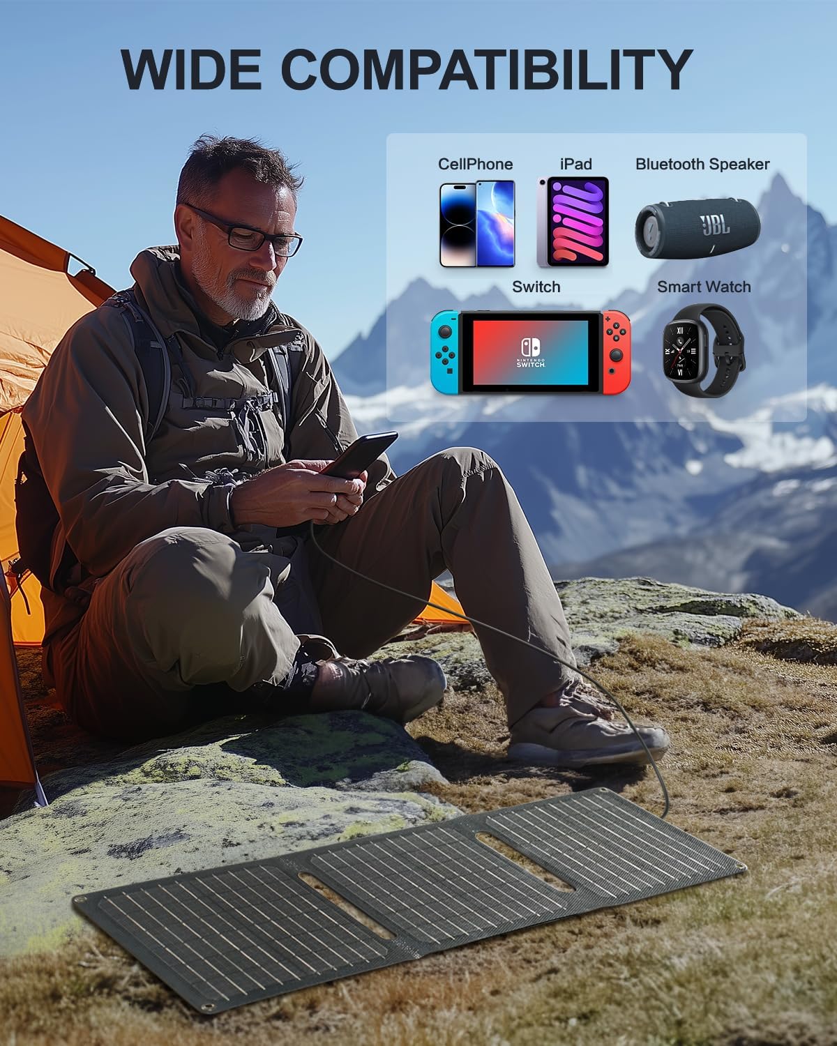 DURABLE AND WIDE COMPATIBILITY: Crafted with a premium ETFE coating, our 21W solar panel charger is built to last. With an IP67 rating, it’s waterproof, dustproof, and ready for any weather. This solar phone charger delivers reliable power to devices like iPhones, power banks, tablets, and more, making it an essential emergency power source for all your adventures