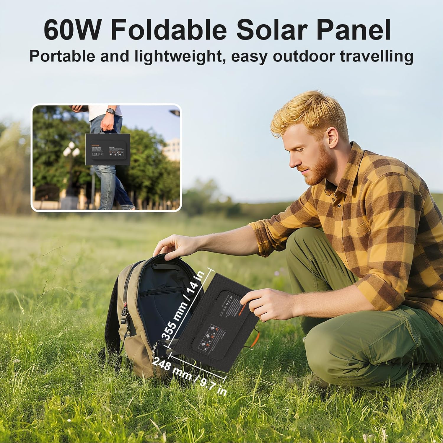 【Portable Camping Solar Panel】Made for mobile camps and off-grid adventures, the 60W foldable solar panel is perfect for longer trips when you need more power without sacrificing portability. With a small size of 9.76 X 13.97 X 1 inches (when folded) and a lightweight design of 4.4lb(2kg) that can be easily squeezed into your backpack, offering portability and simplicity.It is also a must have for stashing in an emergency kit