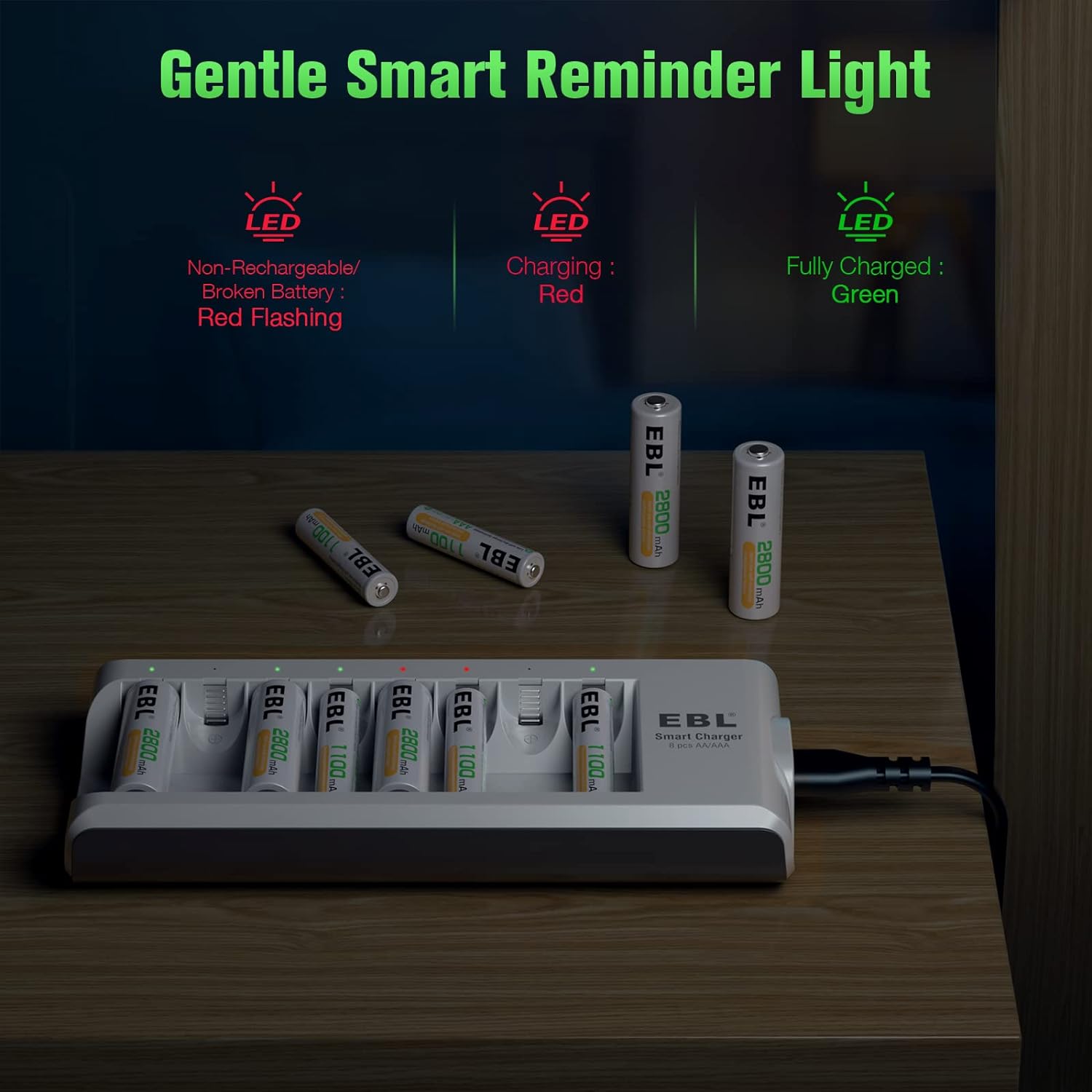 Rechargeable Batteries Charger: EBL upgraded individual charger for aa aaa rechargeable batteries, freely working for 1-8 Ni-MH Ni-Cd Double aa and triple aaa rechargeable batteries.