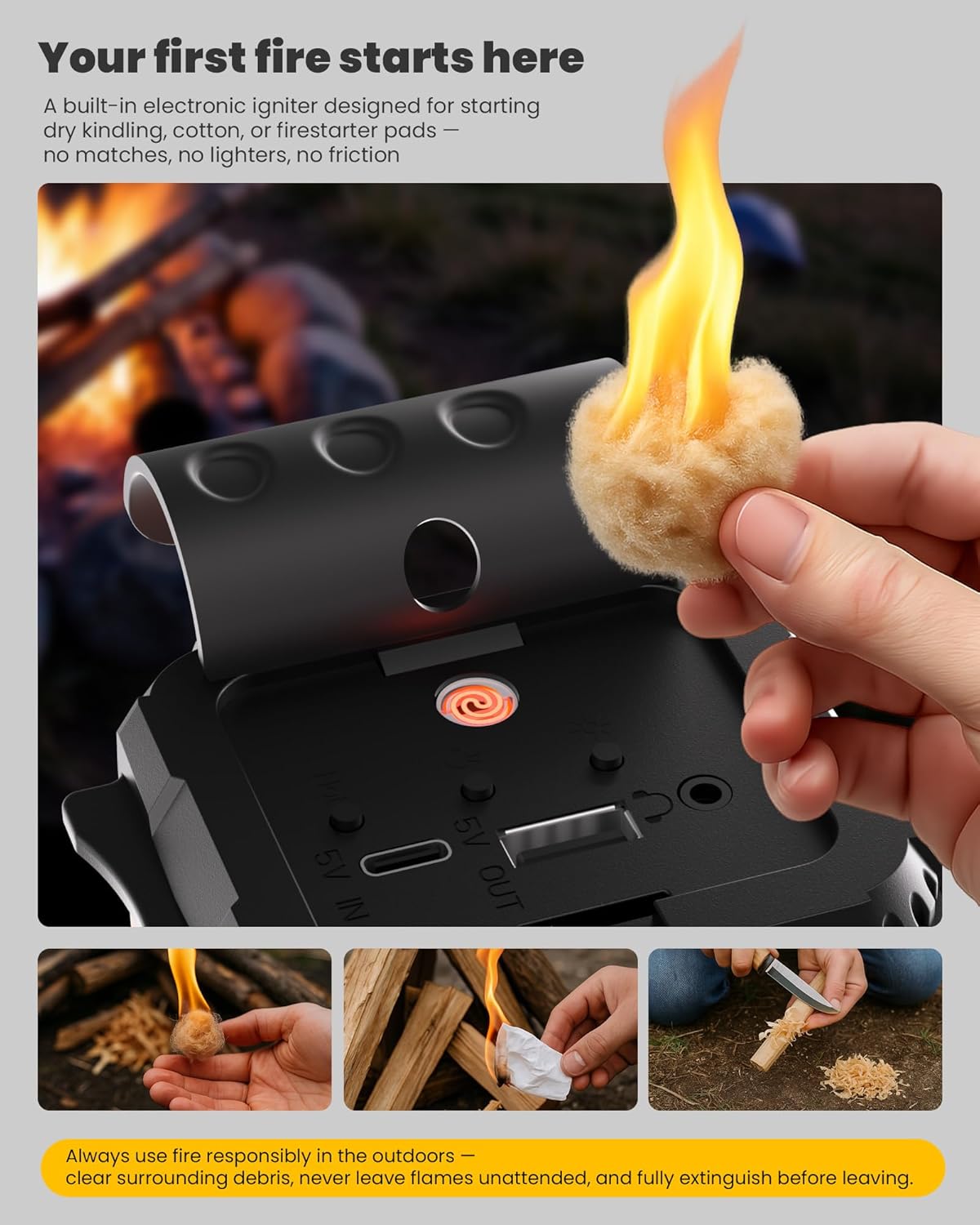 The weather-radio electronic igniter ensures quick, reliable fire-starting for warmth, cooking, or signaling—especially crucial in cold, damp conditions or when traditional methods fail.