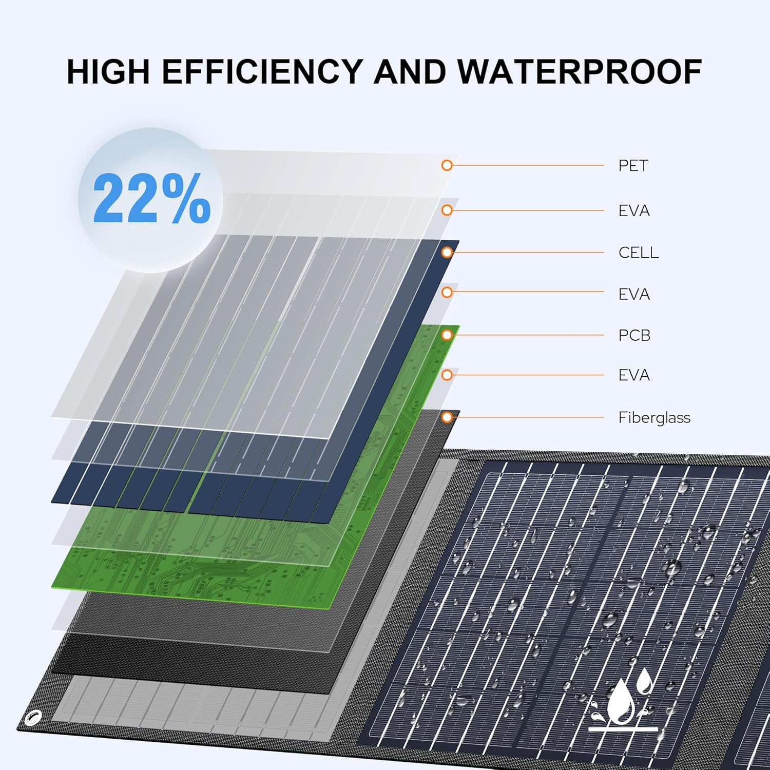 The 22W portable solar panel is foldable and lightweight, so you can carry it easily and travel without burden.It fits perfectly in a backpack.