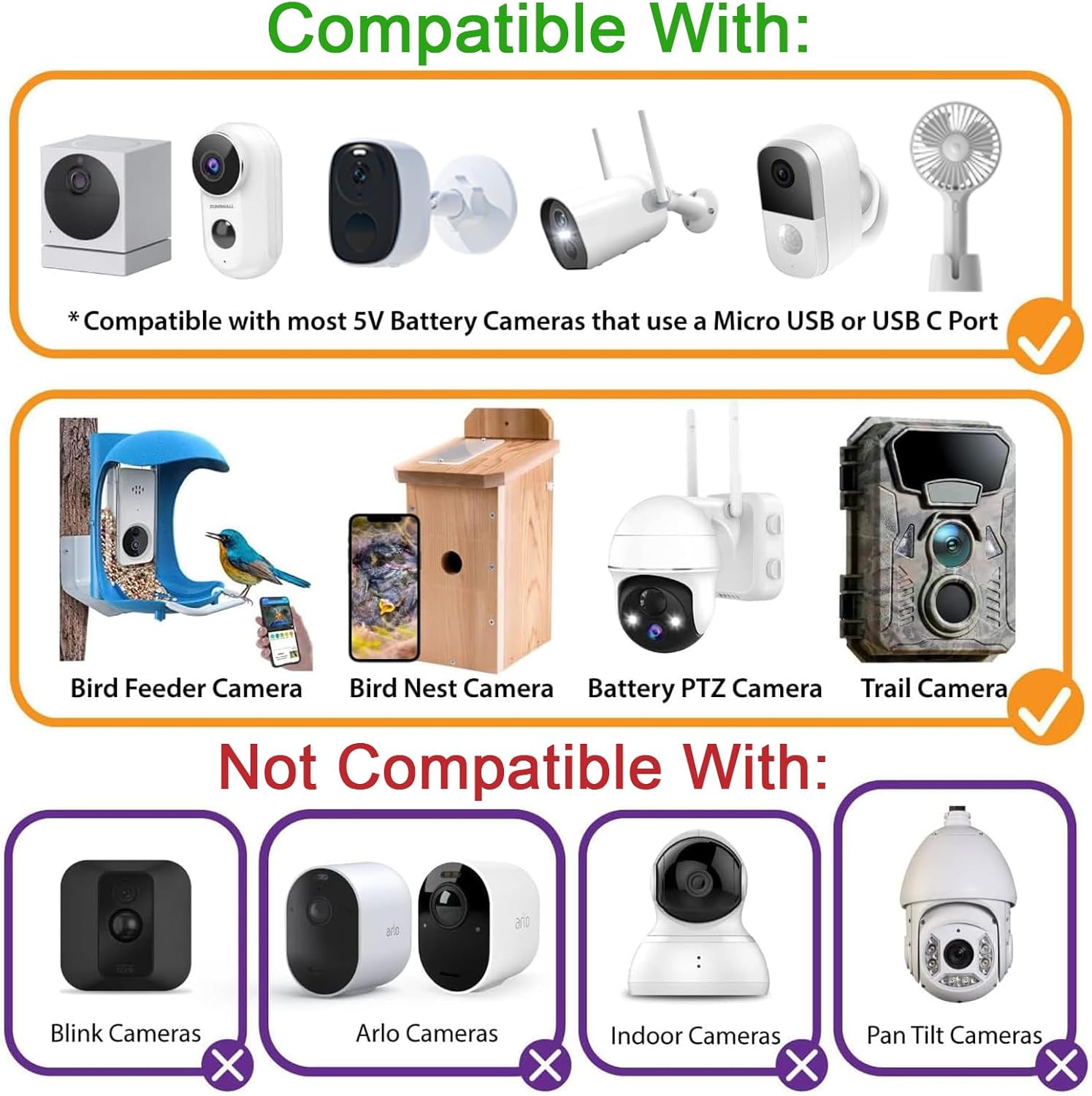Works with most rechargeable battery-powered cameras using Micro USB or Type-C ports. Not compatible with Arlo, Blink, Ring, Google Nest, Kasa, or non-rechargeable cameras.