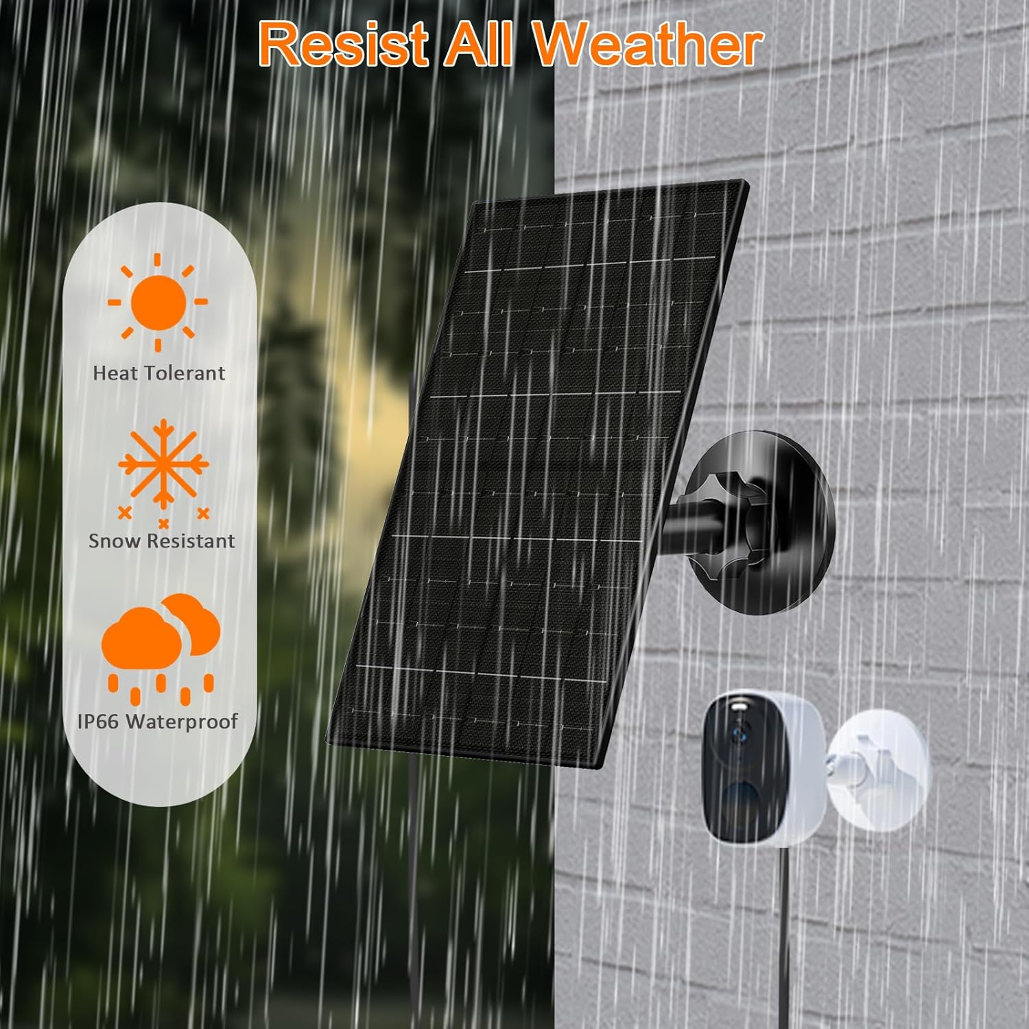 IP66 Waterproof: Built to endure harsh weather, this security camera solar panel features an IP66 waterproof rating. Withstanding temperatures from -5°F to 120°F, it ensures reliable performance in rain, snow, heat, or high winds, making it suitable for outdoor installations in areas like backyards, driveways, or remote monitoring locations.