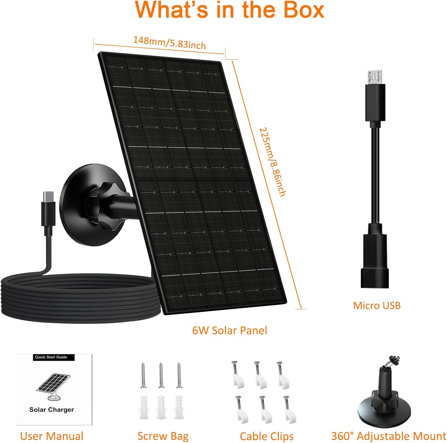 Solar Panel for Security Camera: This 6W USB solar panel is designed to power most rechargeable, battery-operated security cameras with Micro USB or Type-C charging ports. It provides continuous, stable power without the need for frequent battery replacements, making it suitable for long-term use. However, it is not compatible with Arlo, Blink, Ring, Google Nest, Kasa, or other non-rechargeable cameras.