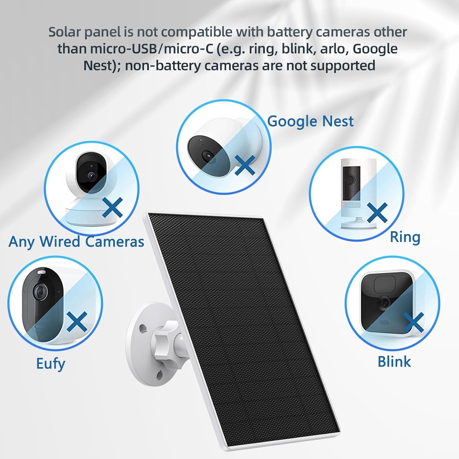 The solar panel do not compatible with Arlo,Arlo Pro!!!, Ring,Ring Spotlight Cam,Google Nest,Eufy,Wyze,Kasa cameras,and any plug-in camera without battery.