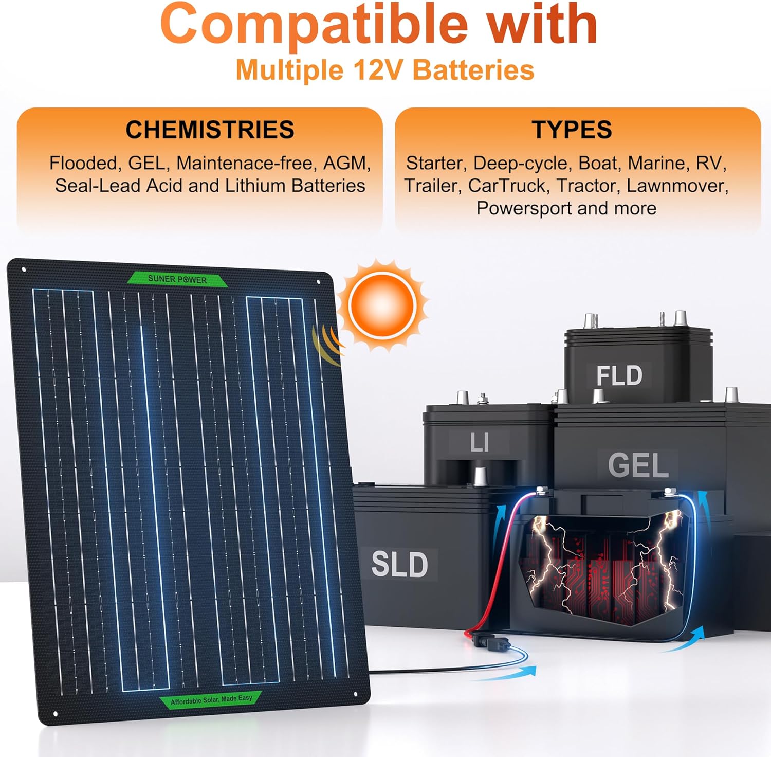 【Ultra-Smart MPPT Technology】This 12v solar panel battery charger is crafted with SUNER POWER’s unique Ultra-Smart MPPT technology, the innovative MPPT ( Max Power Point Tracking) allows to deliver high tracking efficiency of up to 99% and peak conversion efficiency of 98%, improving approximately 20%-30% utilization rate than other competitors.