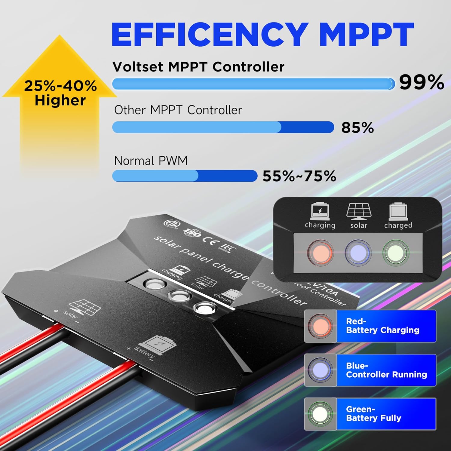 Smart 3-stage Visual Charge: 3-stage charging technology (direct/float/trickle charge) for 12V LiFePO₄, lithium, AGM, SLA, GEL, etc, charging efficiency increased by 18%, controller LED screen displays charging status in real time, three indicators: blue (sunlight exposure), red (charging), green (battery fully charged)