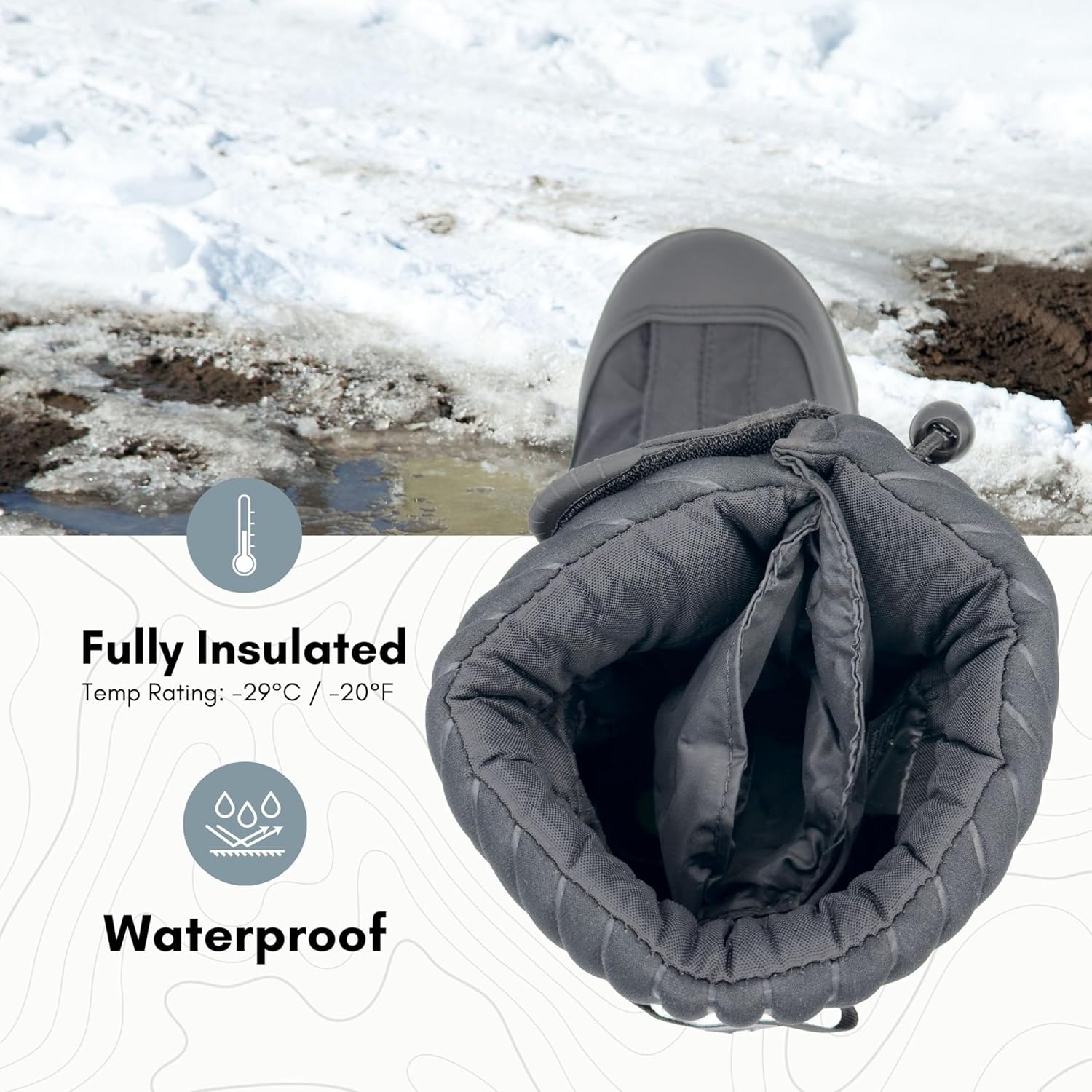 500 Denier waterproof nylon upper protects against water, snow, sleet, rain and wind; lightweight design helps prevent foot and leg fatigue