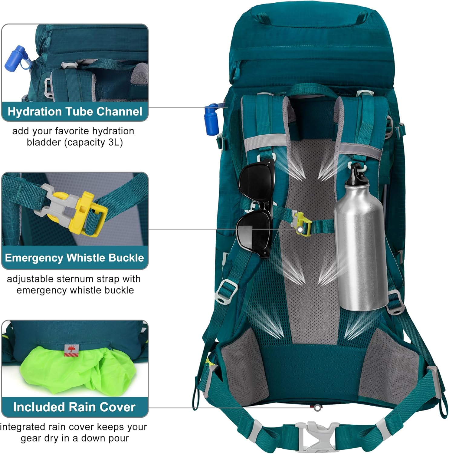 Innovative Design: High-Load Waist Buckle- Waist buckle system stands up under big loads and is easy to tighten and thickly-padded split dual wishbone waist pad with independent top and bottom hip adjustments offers a more custom fit. Practical whistle buckle, D-shape carabiners and easy access zippers, shoulder straps, hip straps. Ergonomically designed semi-circle hollow provides head comfort even when backpacking backpack is completely full. Good for men women.
