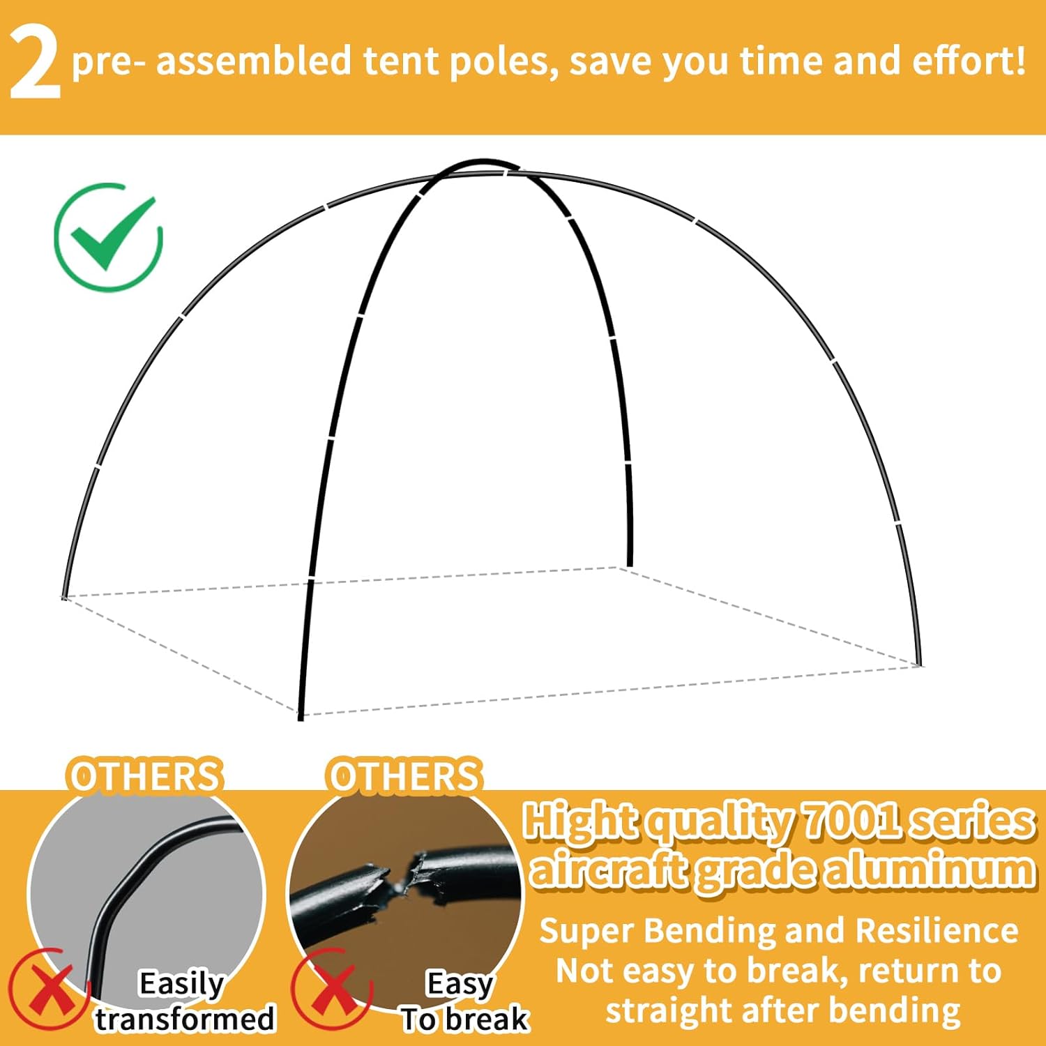 PRE-ASSEMBLED QUICK SETUP: Factory-connected segments with integrated elastic cord allow instant deployment, reducing setup time by 60% compared to traditional pole kits for universal tent compatibility, ensuring stable structure reinforcement within minutes