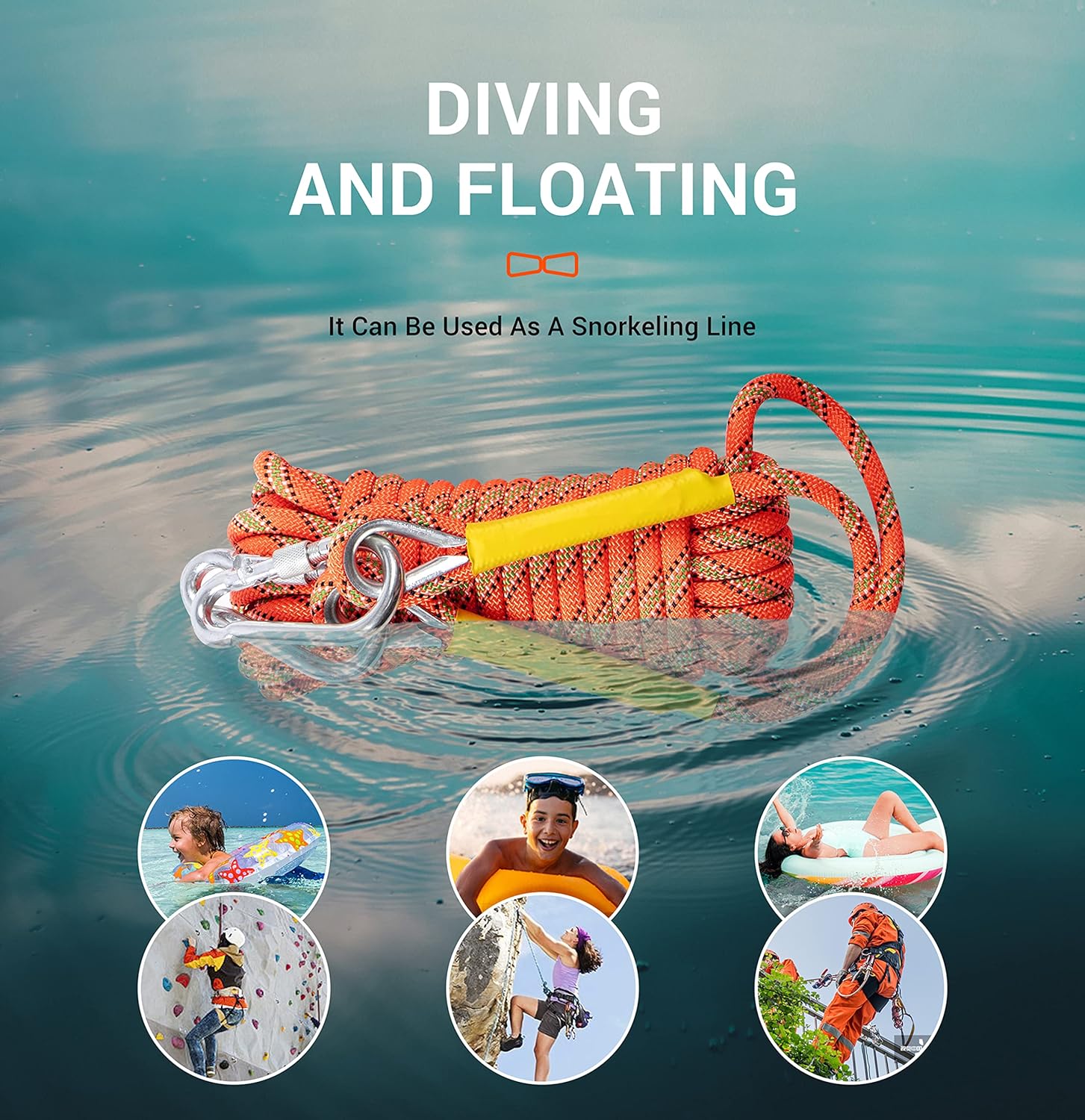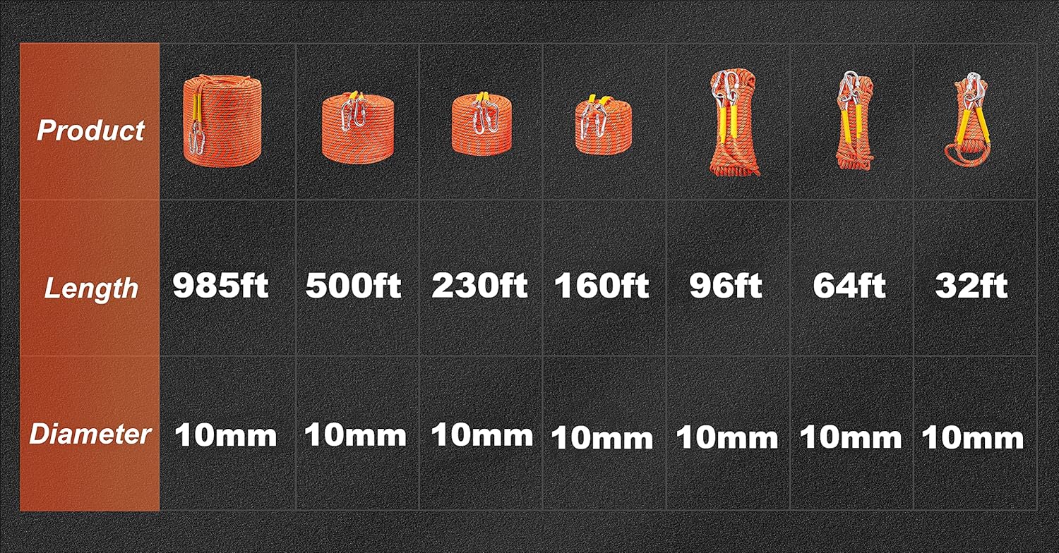 · ATTENTION: Please note that the two included carabiners are only for daily use. They are not for professional mountaineering. Each purchase will get One Climbing Rope + Two Steel Buckles + One Carry Bag. We offer eight options: 32ft/64ft/96ft/160ft/230ft/500ft/985ft/1000ft.