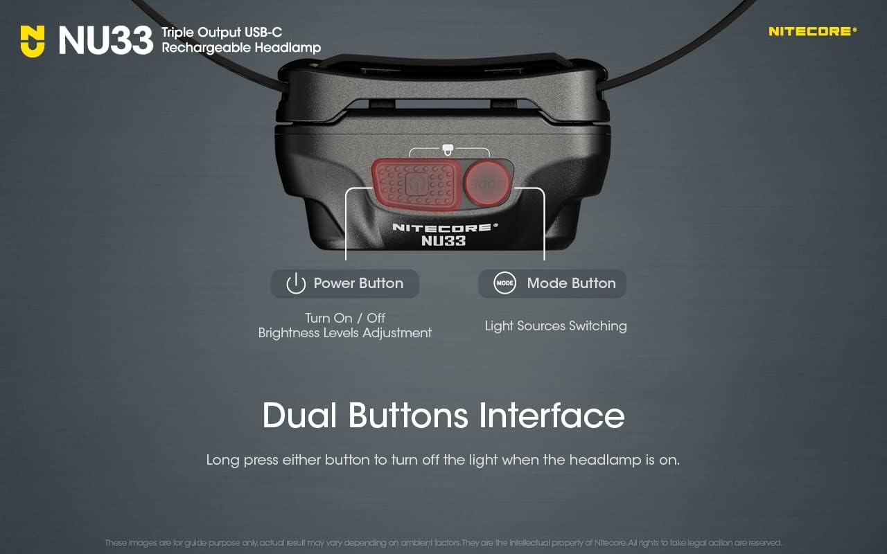 The NU33 headlamp features two clearly marked switch buttons, simplifying its operation for users.