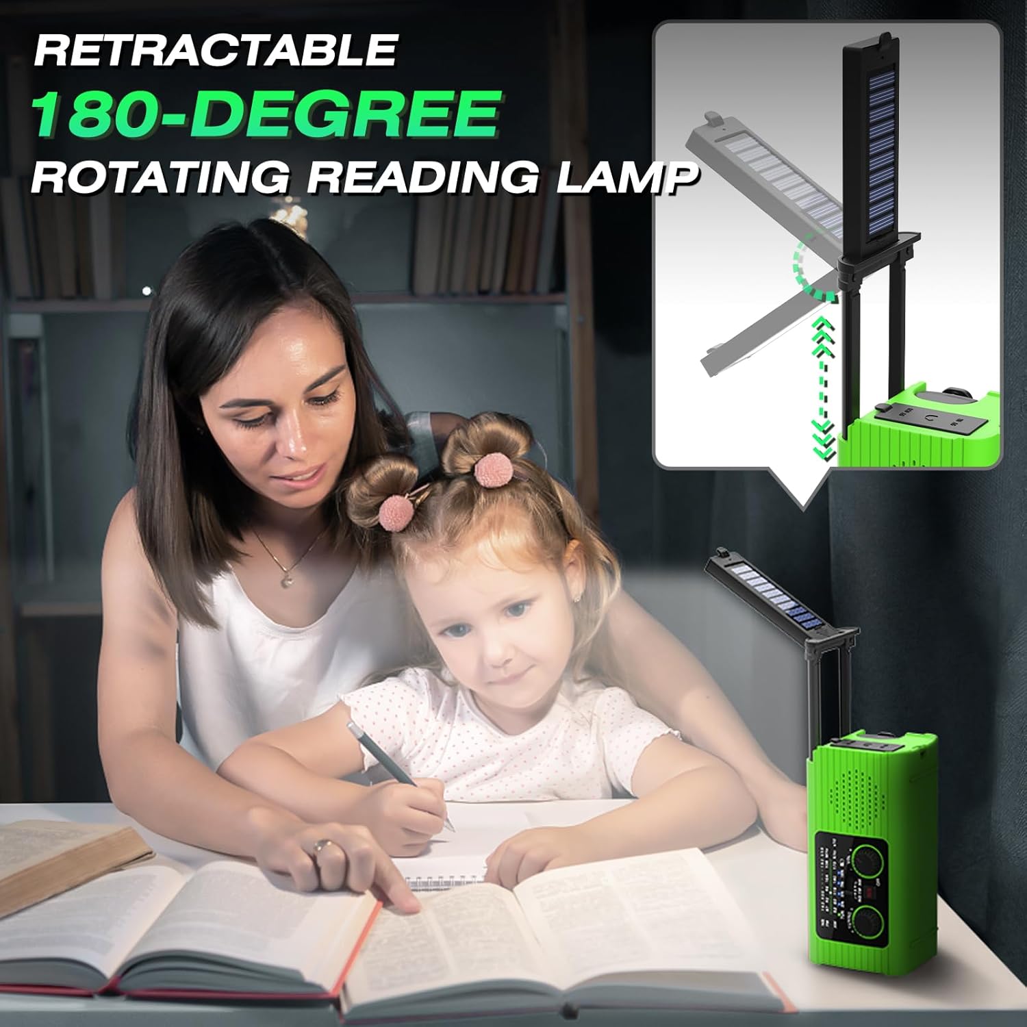 [Multi-Functional for Emergencies]: Emergency weather radio with an ultra-bright LED flashlight and extendable 180° rotatable reading lamp that can be adjusted to any angle to illuminate a large area, keeping you out of the dark during emergency power outages or at night. Loud SOS alarm and eye-catching flashing light to call for help in emergency to escape from any danger. Solar crank radio can charge your phone, tablet and USB devices to provide emergency power
