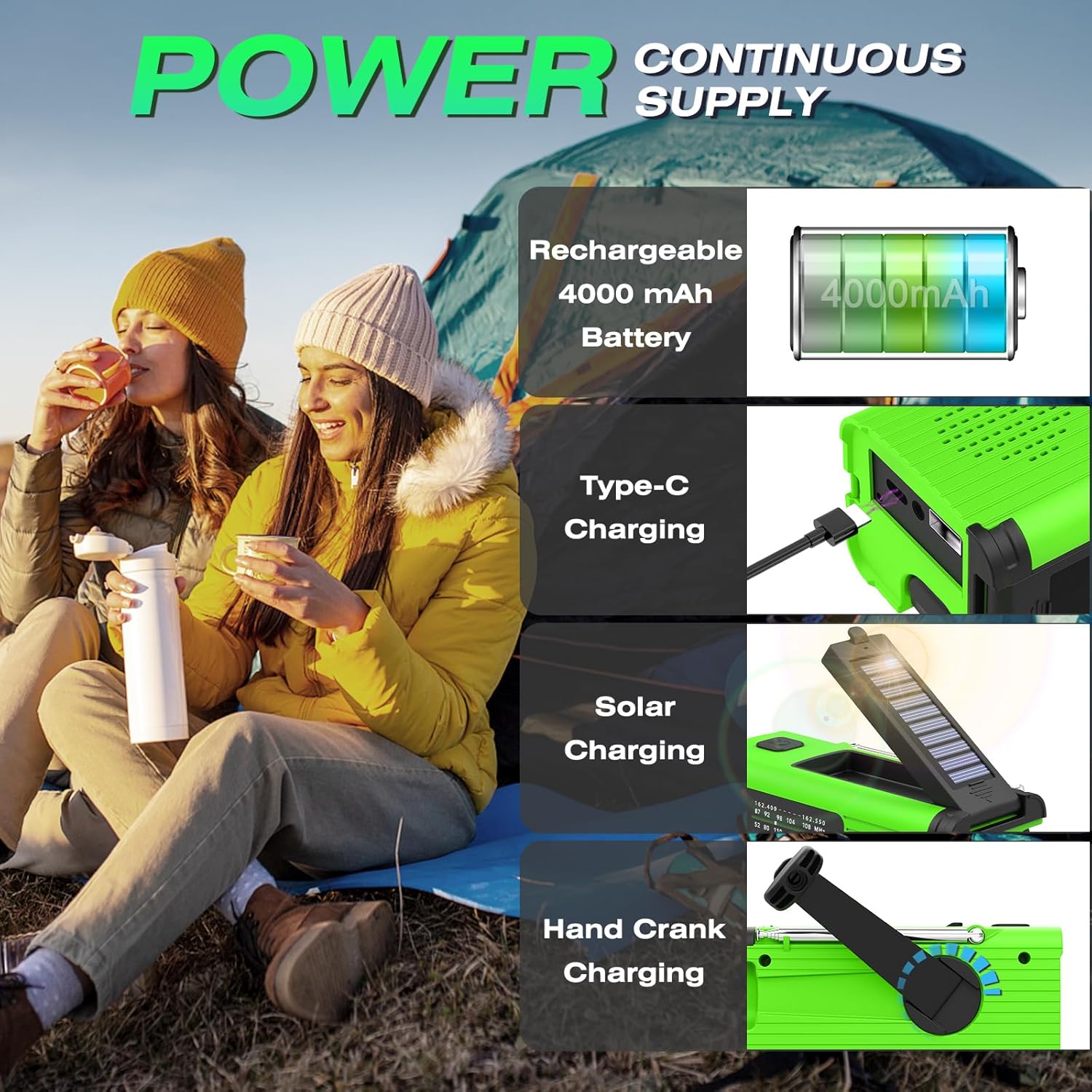 [Continuous Power Supply]: Emergency radio is always at the ready! The powerful weather radio has 3 charging options, with a 4000mAh rechargeable battery that can be charged via USB cable, solar panel or hand crank. More convenient and reliable for instant, automatic, all-day messaging about weather alerts. Remains operational in the event of an emergency power outage