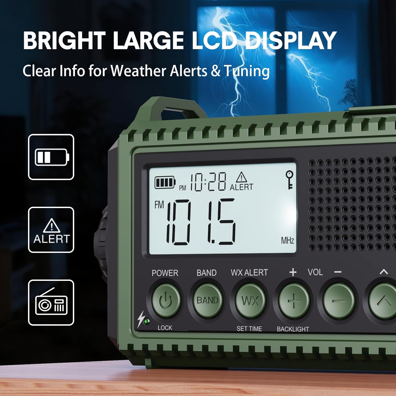 ๐๐ฎ๐ฟ๐ด๐ฒ ๐๐๐ ๐๐ถ๐ด๐ถ๐๐ฎ๐น ๐๐ถ๐๐ฝ๐น๐ฎ๐ & Precision Digital Tuning (AM/FM/SW): Operate your radio with confidence using the bright, easy-to-read LCD screen. View time, battery percentage, tuning frequency, and alert status in real time. Digital tuning with auto-scan makes finding AM/FM/SW channels fast and precise. Includes 16-level volume control and a 3.5mm headphone jack for private listening.