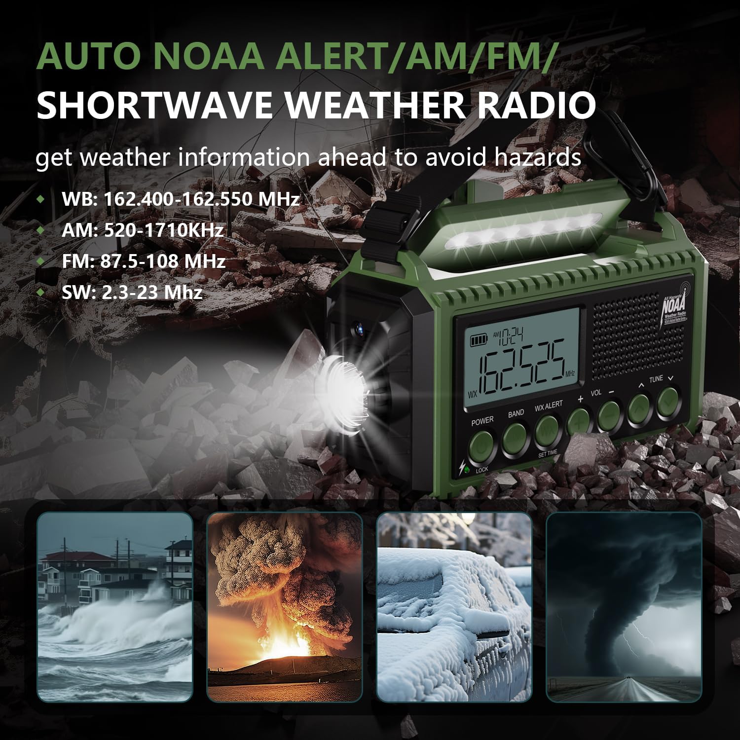 Emergency Weather Radio with ๐๐๐๐ผ ๐ก๐ข๐๐ ๐๐น๐ฒ๐ฟ๐ System: Stay protected during hurricanes, tornadoes, and severe storms. This upgraded emergency radio automatically monitors all 7 NOAA weather bands and instantly triggers a loud siren and flashing red alert light when hazardous conditions appearโno manual tuning required. Get life-saving warnings even while in standby mode.