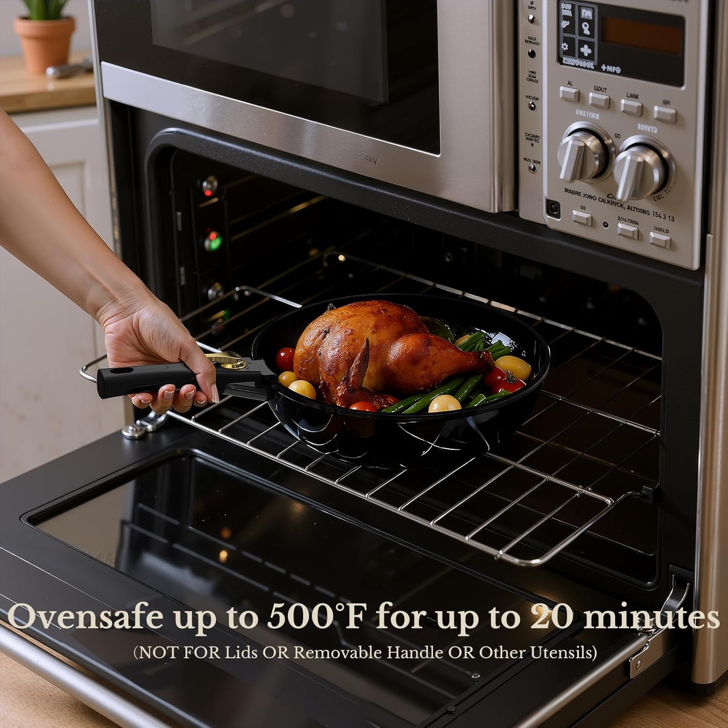 Multitaskig Cookware Set: Removable handle for the ultimate versatility– go from ALL kinds of stoves including gas, electric, induction etc to the oven, to the grill, to the fridge, and onto the table in a click.Perfect for compact kitchens and an ideal choice for RV or camping
