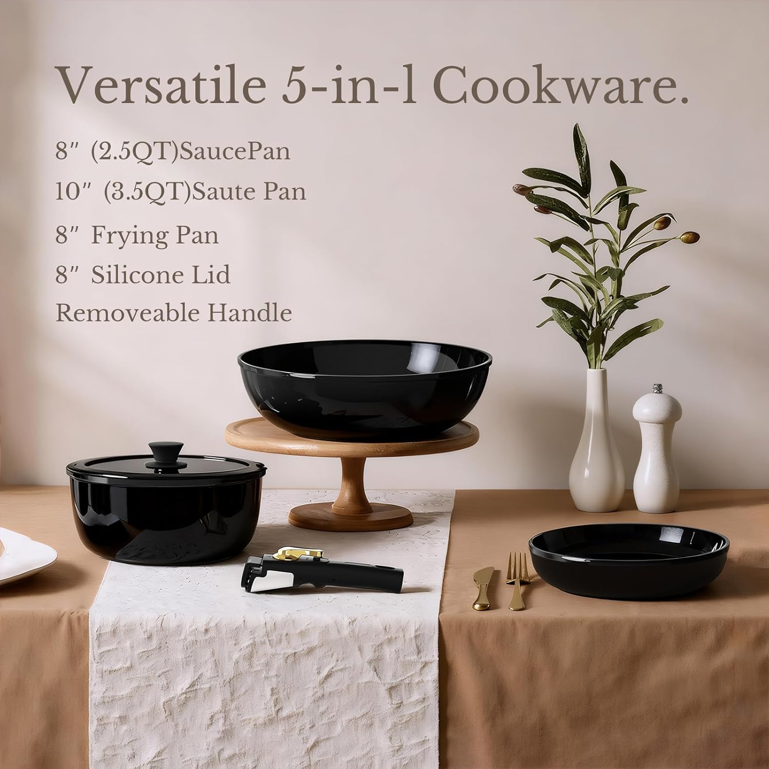 Multitaskig Cookware Set: Removable handle for the ultimate versatility– go from ALL kinds of stoves including gas, electric, induction etc to the oven, to the grill, to the fridge, and onto the table in a click.Perfect for compact kitchens and an ideal choice for RV or camping