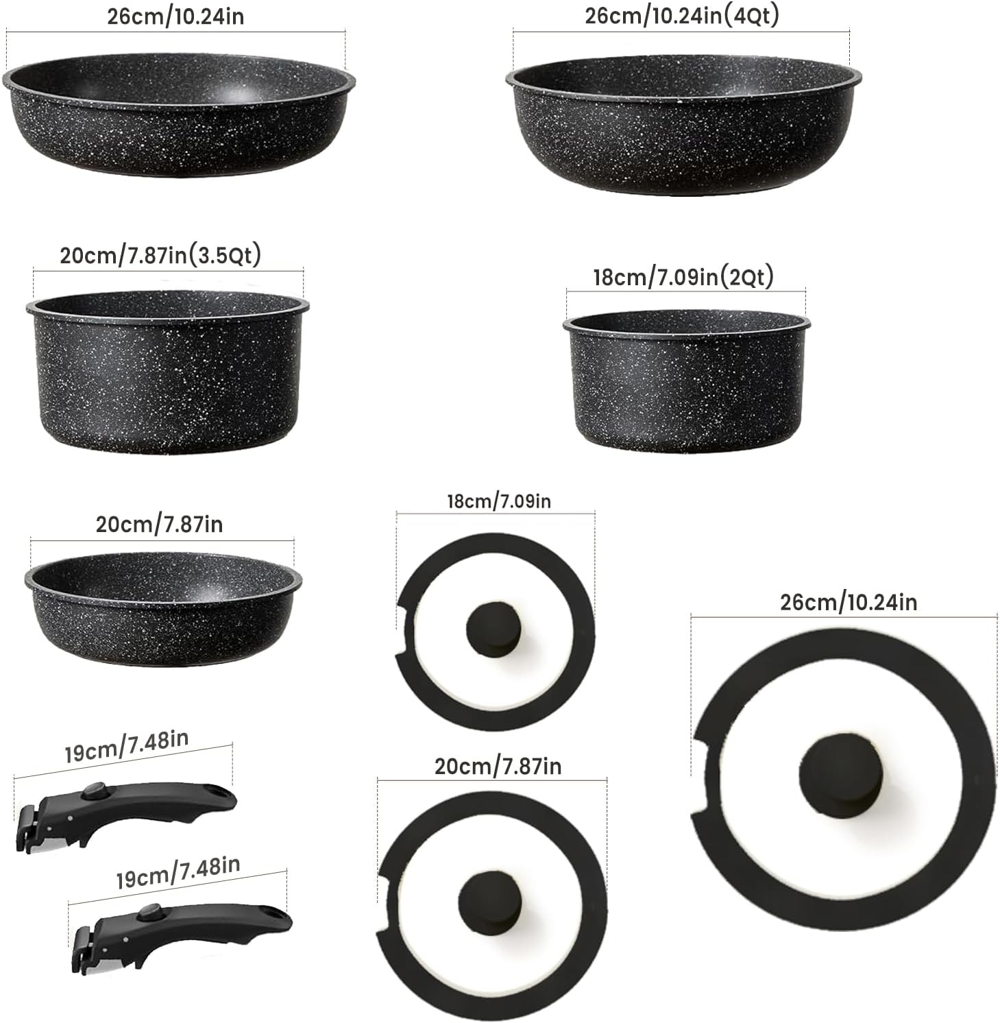 Best storage:Stackable pots and pans and detachable handles save up to 70% space and can be stored in a cupboard or RV. Keep pots and pans neatly stacked in cabinets or drawers; Suitable for compact Spaces, RVS and campers.