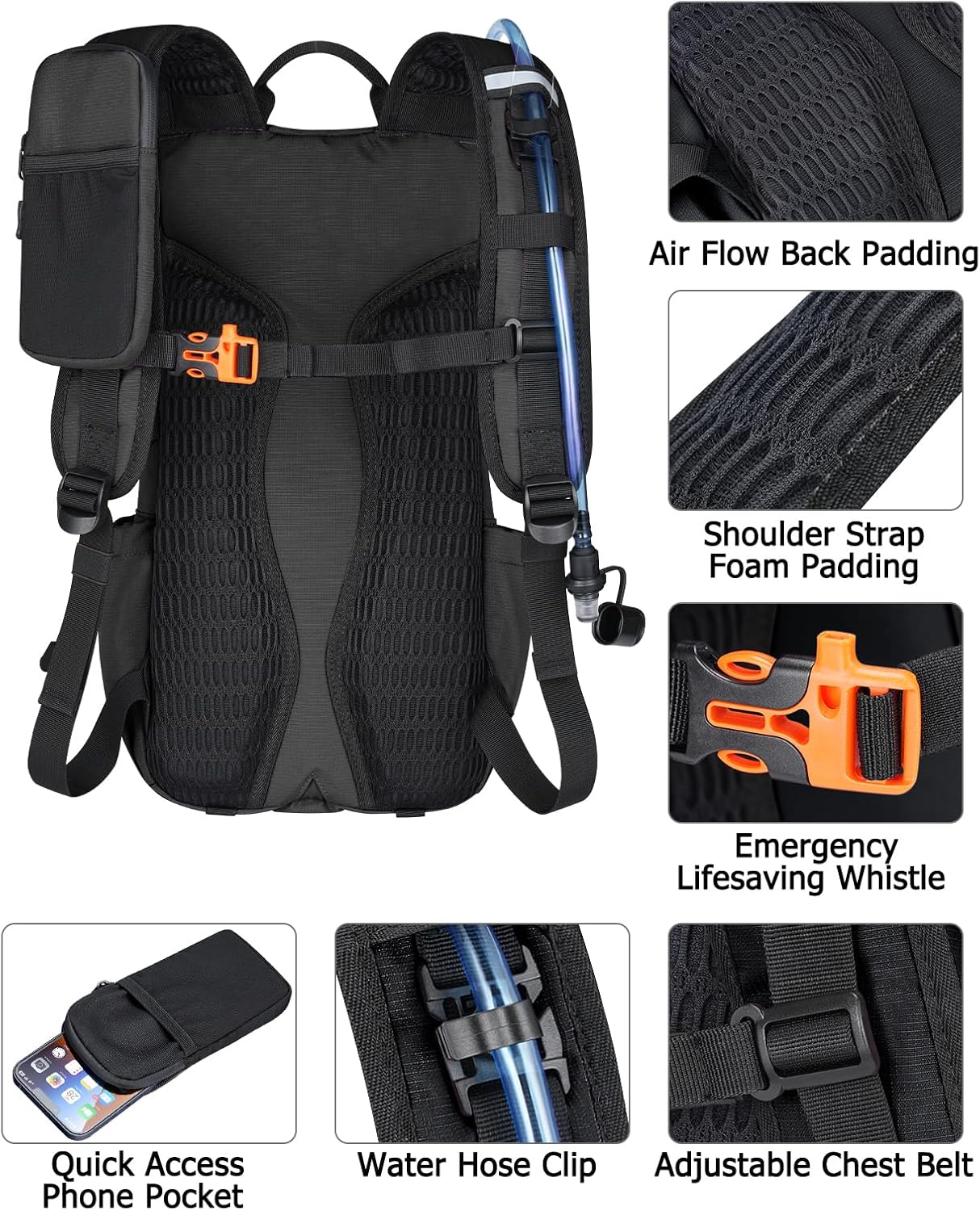22L Storage Capacity – The size of our hiking backpack is 17.3 x 11.5 x 7 inches and has a large capacity of 22L. The hiking hydration backpack for men and women is made of high-density ripstop and wear resistance polyester to meet the needs of outdoor adventures. Additional gear: Integrated emergency whistle and reflective strips adds safety for outdoor adventures.
