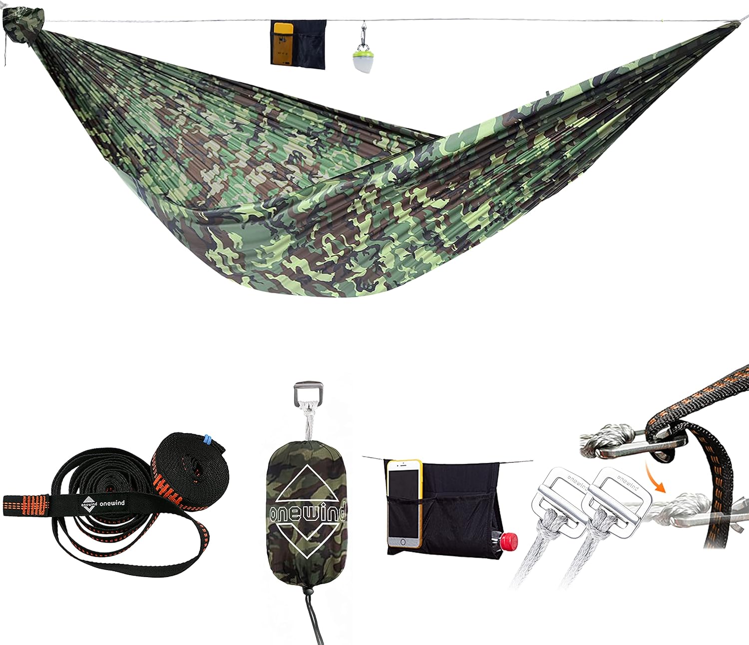 The Original Camping Hammock Bundle Includes Single Hammock, Rain Fly, Mosquito Net, 2 Tree straps, 2 12kN Aluminum Carabiners, 2 Stakes, and 2 Guy Lines
