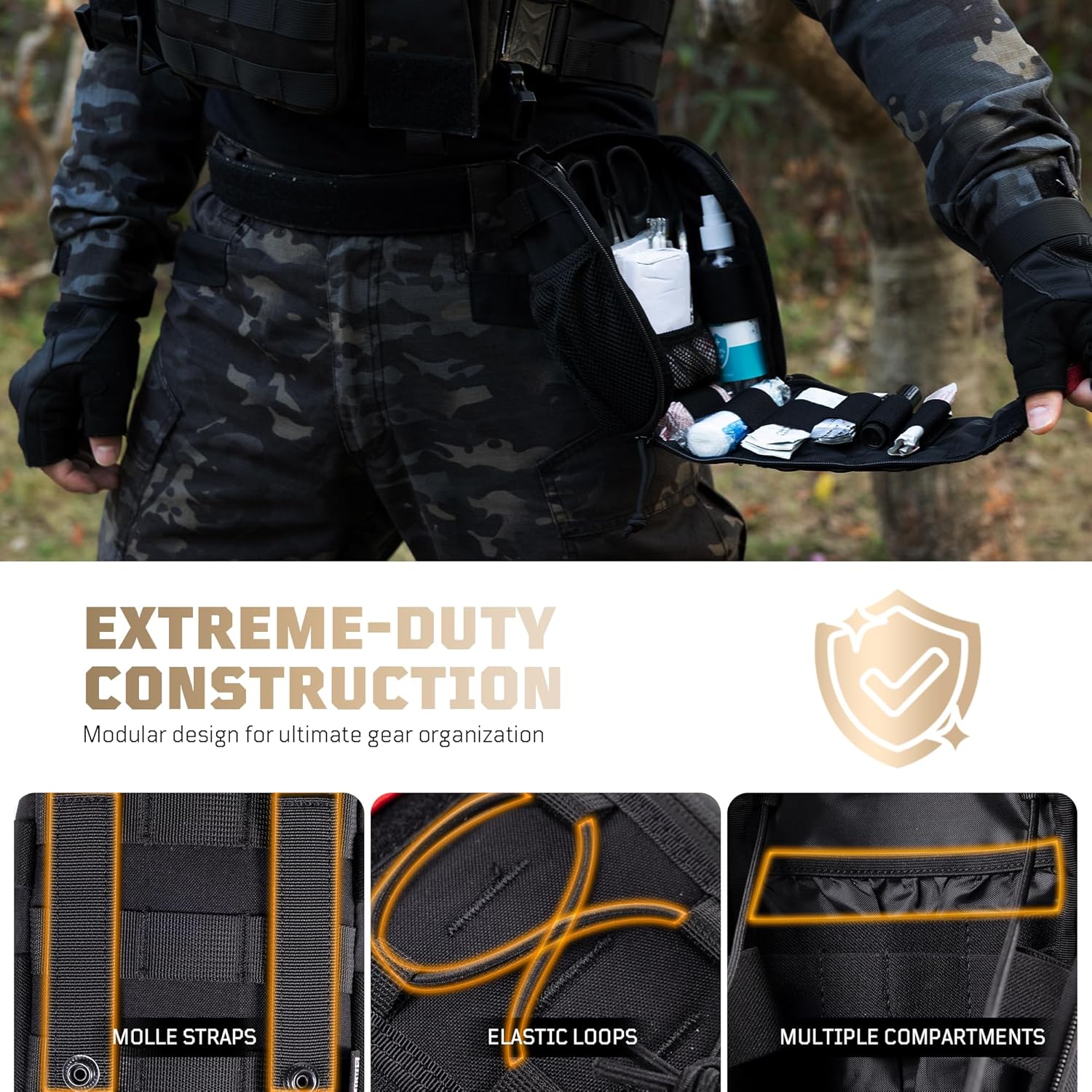 Molle Compatible – The molle medical pouch comes with Molle webbings with 2 snap-buttoned straps and reinforced stitching on all stress points for easier and more organized storage, you can easily use the snap buttons to weave it through your tactical vests and backpacks