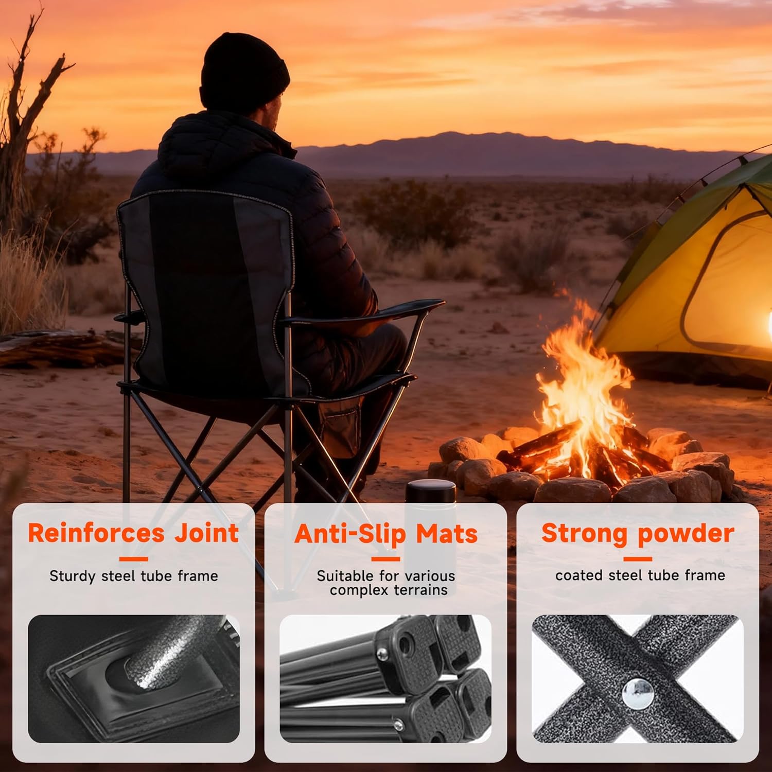 【Excellent Weight Capacity】The sturdy scratch-resistant paint-coated frame can support up to 500 lbs (226kg),and the non-slip textured feet ensure that the outdoor chair remains stable and safe in any situation, whether on the living room lawn or in the wilderness.
