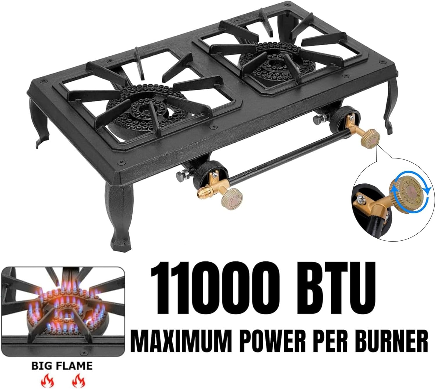 Material: cast ironColor: blackEnergy type: propane gasSize: 20″L×11.3″W×5.2″HTwo burner stove extend the cooking space, allows you to stir-fry and cook at the same time.The burner works with propane gas cylinder, it is controlled by a simple air valve and provides excellent heat control.Small and light construction, easy to carry out, a good helper for your outdoor camping life.