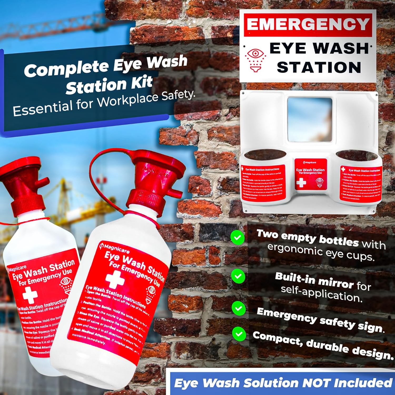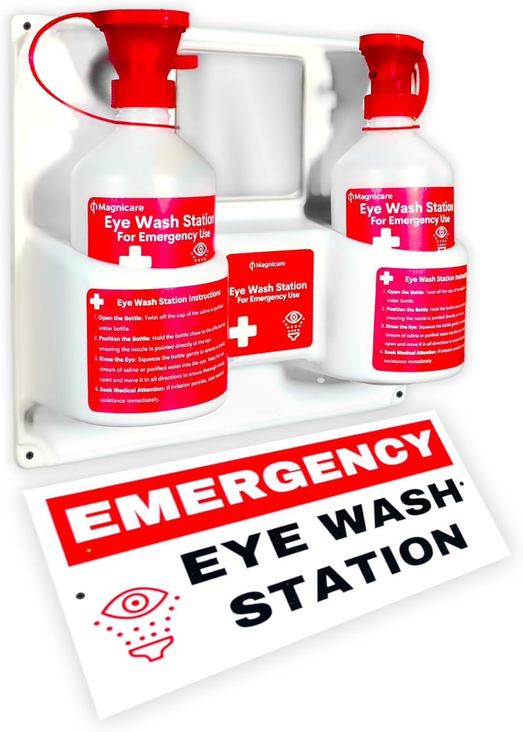 Complete Emergency Eye Wash Station Kit – Be prepared for eye contamination emergencies with a fully equipped kit designed for immediate response. This set includes a durable plastic wall mount, two empty 16oz bottles with ergonomic eye cups for effective rinsing, a built-in mirror for self-application, an emergency safety sign for visibility, and screws with anchors for flexible installation. Note: Eye Wash Solution is NOT included.