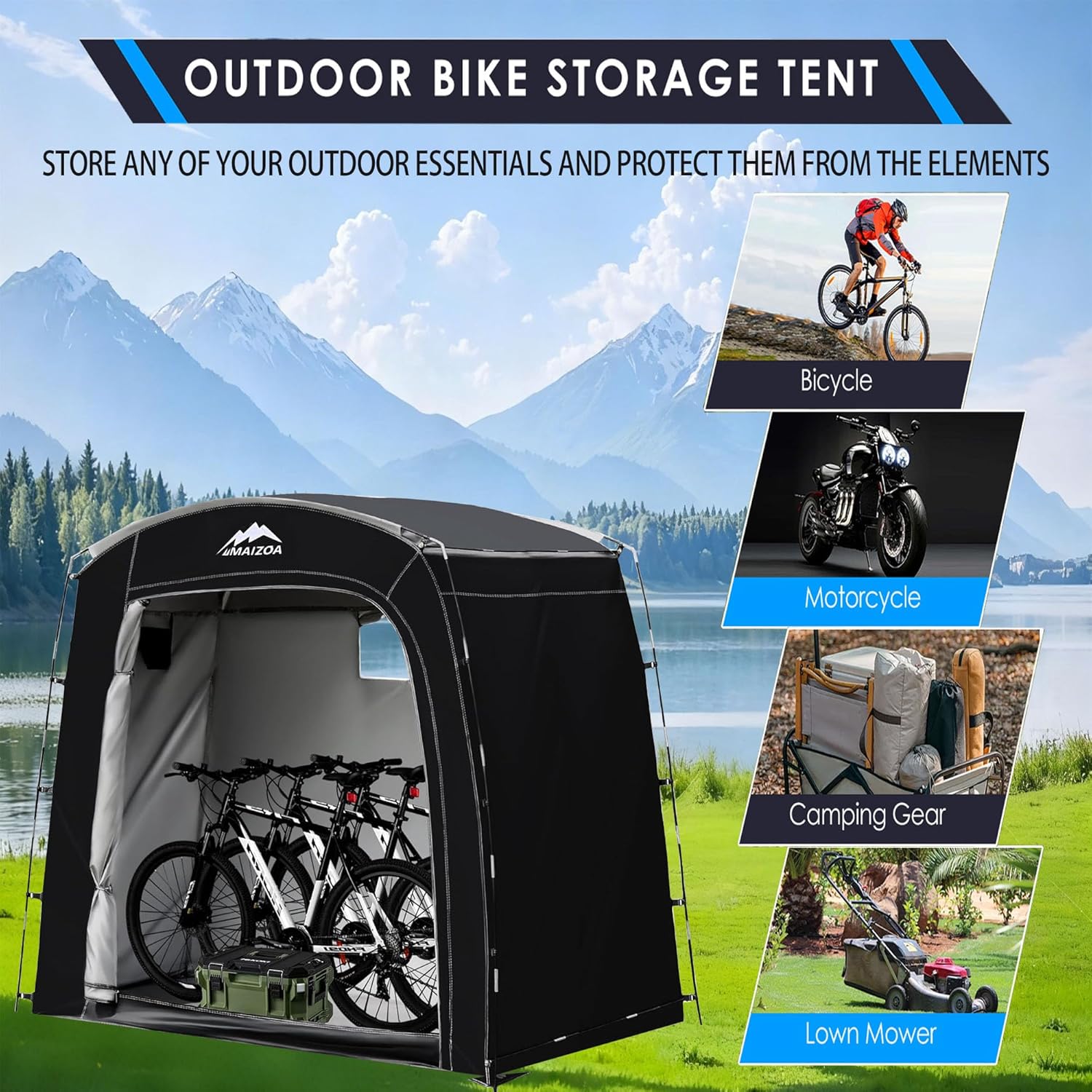 【Versatile for Any Scenario】 MAIZOA Bike sheds adapt to gardens, campsites, or home storage, safeguarding lawnmowers, pool gear, toys, and more. Durable yet compact when folded, they’re a must-have for outdoor travelers and families seeking flexible, space-saving solutions