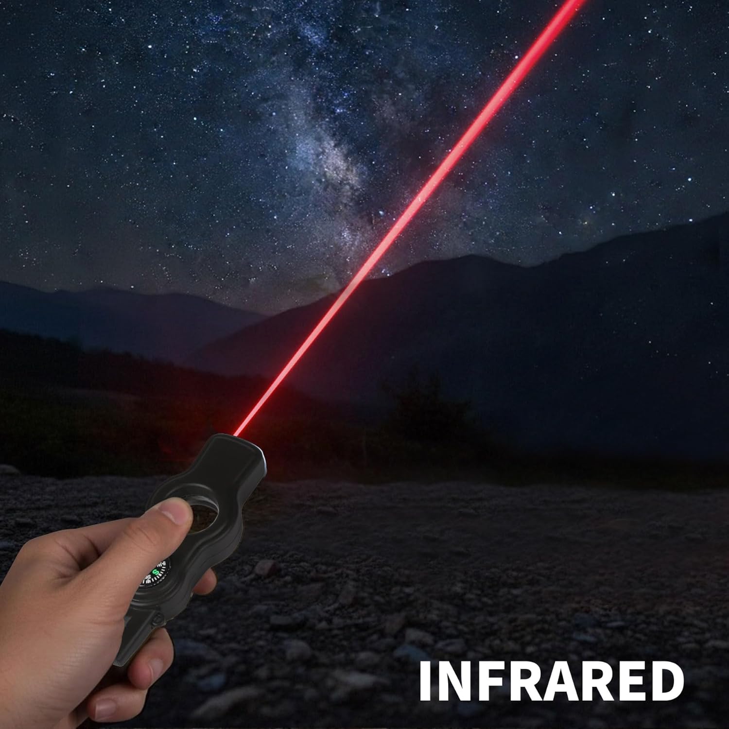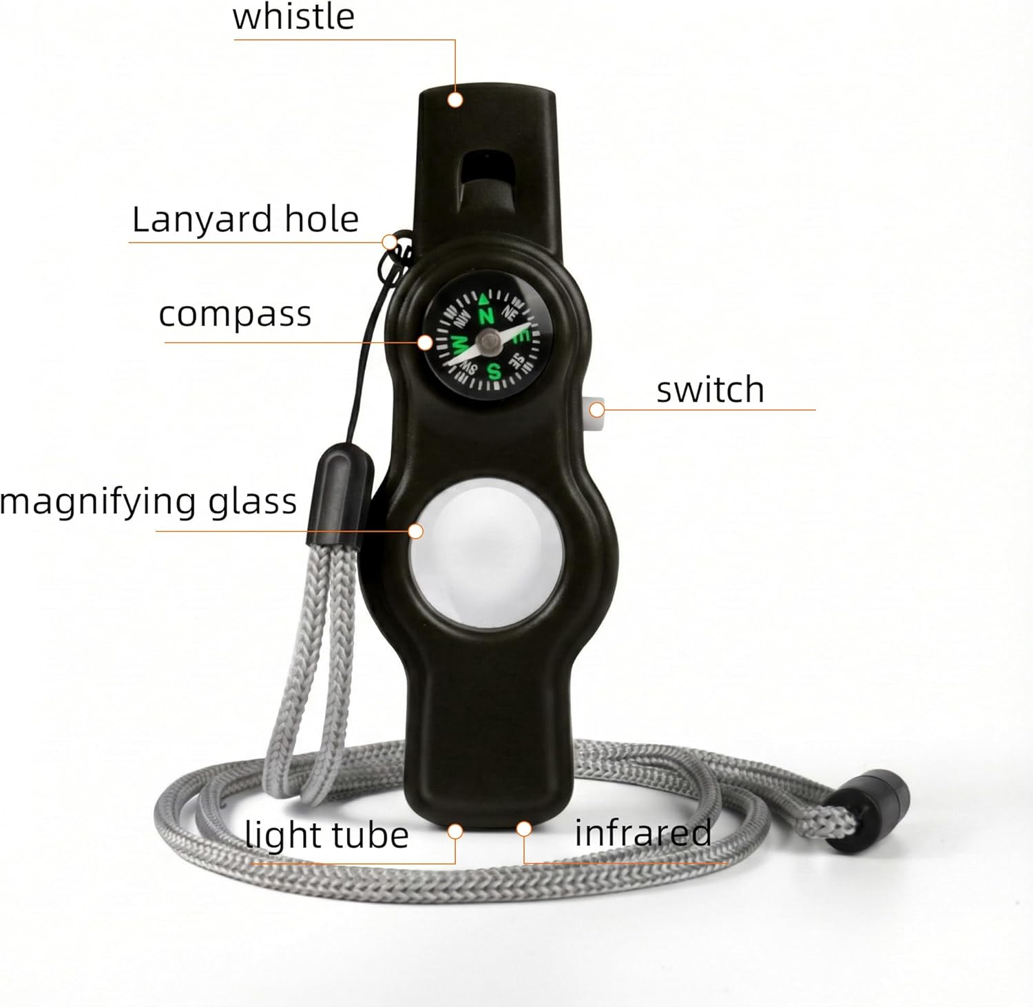 The 5-in-1 Safety Whistle sets 5 functions including Emergency Whistle, Compass, LED Signal Light, magnifying glass, Infrared rays (NOTE: If you need help in an emergency, you can try whistling softly, which is louder than whistling at full force)