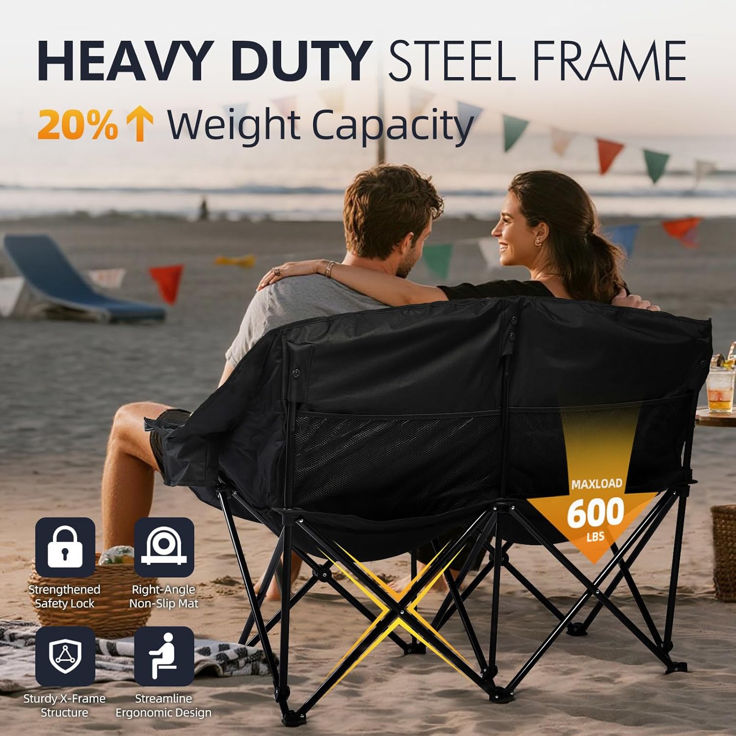 Heavy-Duty Lawn Chair – Our loveseat camping chair features reinforced X-frame steel, dual vertical load-bearing tubes, and anti-slip feet ensuring unmatched heavy-duty camping sofa support up to 600lbs each side. Outdoor camping couch is made of sturdy 600D oxford fabric for long-lasting use.