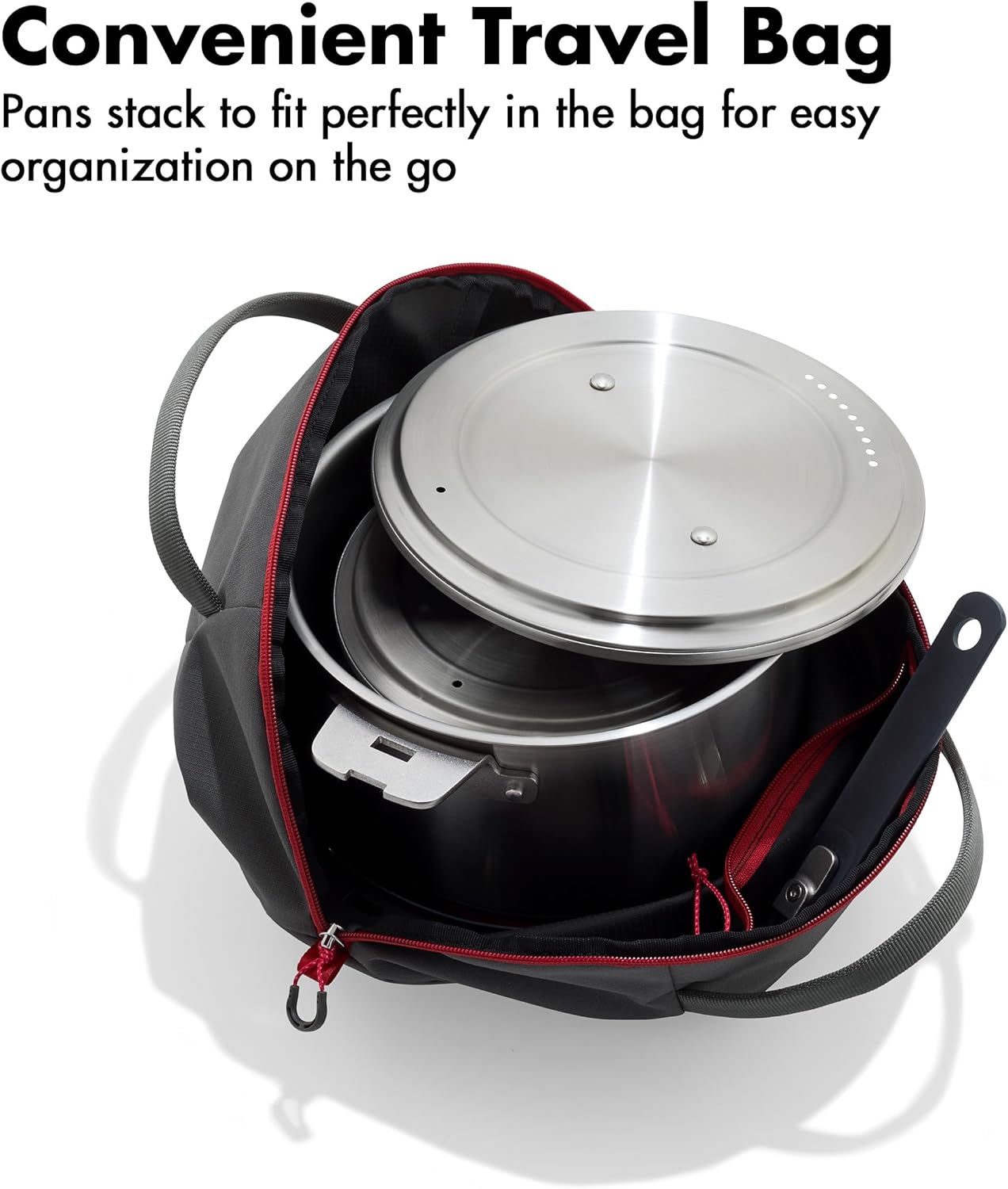 The OXO Outdoor 8-piece Cookware Set is a camping trip game-changer. The 10″ frying pan is crafted from pre-seasoned carbon steel, perfect for high-heat cooking over an open flame, while the saucepan and stockpot are crafted from durable stainless steel with encapsulated bases and are perfect for stews, soups, and more. The clip-on handle fits all pans in this set and allows you to cook directly over flames, then easily detach for hassle-free storage. As you cook, the carbon steel frying pan develops a natural non-stick patina that makes cleaning a breeze. This camping set also includes a silicone trivet for safe handling and a travel bag to keep everything organized. Experience high-performance cookware for every meal under the stars with OXO Outdoor.