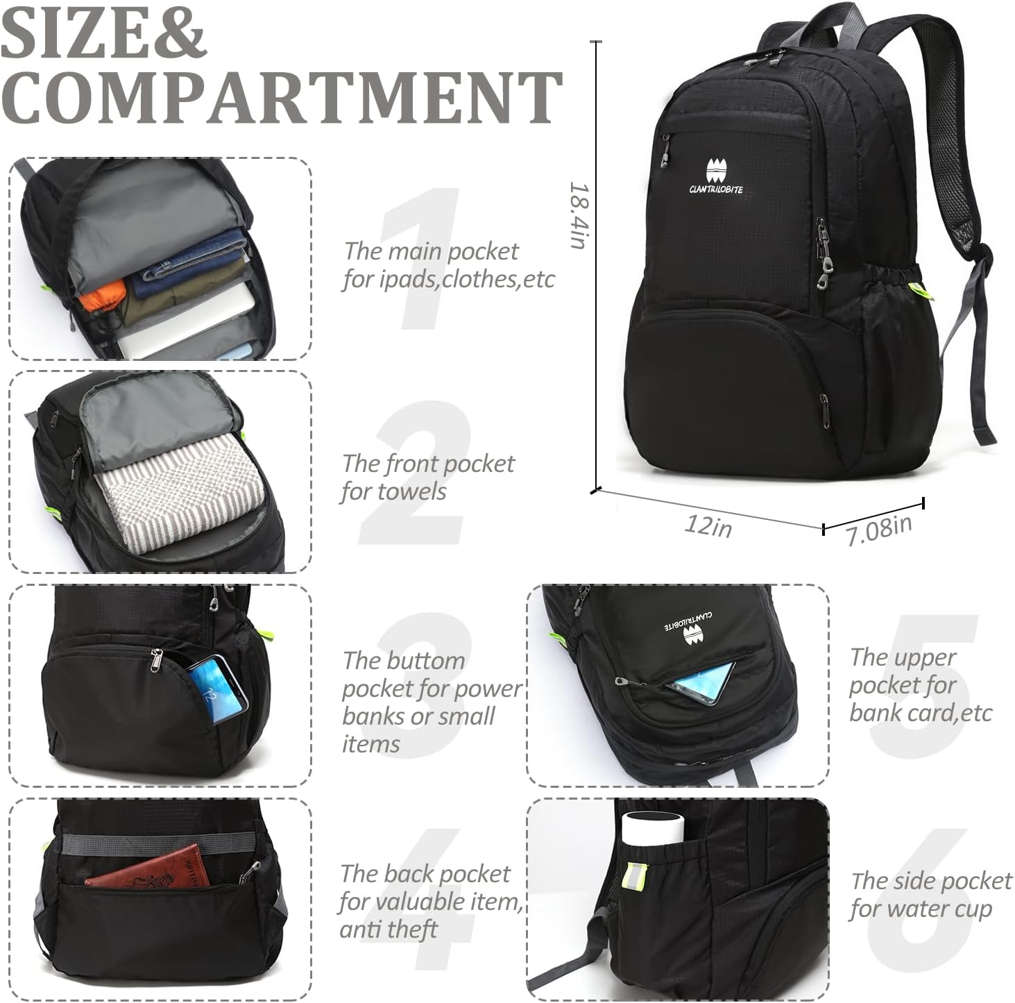 【Lightweight & Foldable】The opening size of the backpack is 18.3x12x7.08 inch,and the folding size is 7.08 x 9.44 inch.When you do not use the foldable backpacks,you can fold it into a compact pocket,and then open the black backpack when used.The 30L backpack complies with most airline carry-on regulations. This packable backpack weighs only 0.66LB, lighter than 4 eggs.Say goodbye to the burden of heavy backpacks!