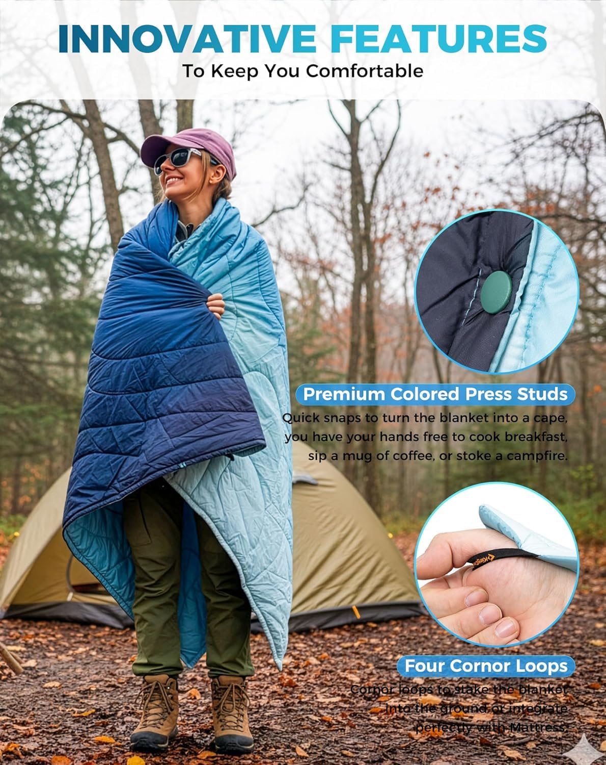 WEARABLE DESIGN – HANDS-FREE COMFORT: This camp blanket features snap buttons and corner loops, easily transforming into a wearable shawl or cape. Stay cozy and mobile while walking the campsite, watching outdoor games, or relaxing by the fire. The 78.7″L × 57.1″W size and connectable design comfortably wrap two people—perfect for shared adventures and hands-free warmth.