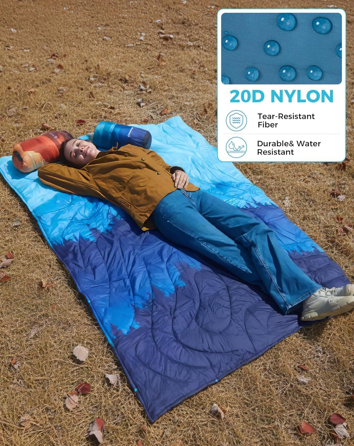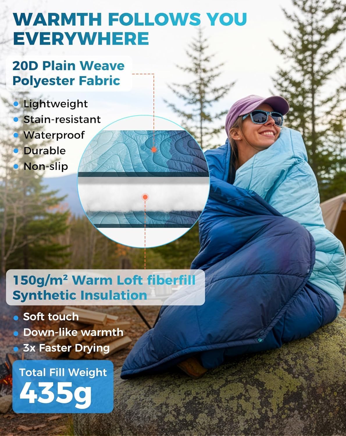 ALL-WEATHER WARMTH – COZY SYNTHETIC FILL & DURABLE SHELL: Filled with 435g of hypoallergenic Warm Loft fiberfill, this puffy camping blanket provides warmth and softness similar to natural down, without allergens or animal materials. The tightly woven 20D polyester shell is windproof and water-resistant, effectively blocking out cold air. Contour quilting ensures even fill distribution and reduces cold spots, providing lasting warmth whether at home or outdoors.