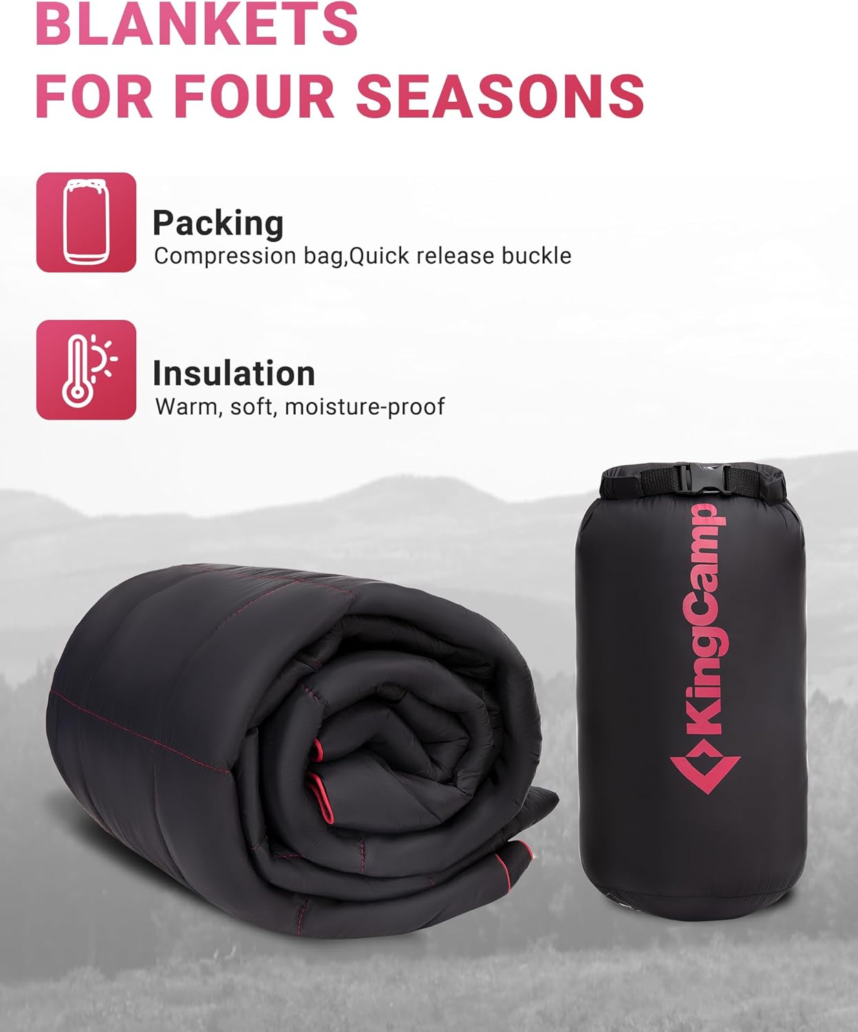 COZY WARM LOFT FILL WITH DURABLE 20D NYLON SHELL FOR ALL-WEATHER WARMTH: Filled with 150G/㎡ of hypoallergenic Warm Loft fiberfill, this camping blanket provides warmth and softness similar to natural down, without allergens or animal materials. The tightly woven 20D nylon shell is water-resistant and windproof, and helps trap body heat and block cold air—enhancing insulation to keep you warm and comfortable at campsites, beaches, or mountain cabins.