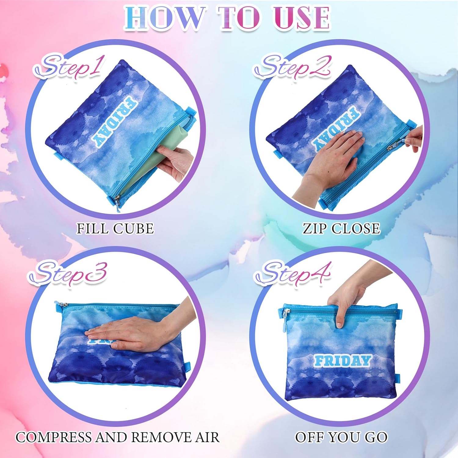 Outfit for [every Day of the Week]: each bag measures 10.75 x 9.25 inches, the surface is marked: monday, Wednesday, Thursday, Tuesday, Friday, Saturday and Sunday; With this set of luggage organizers, you no longer need to mark the date, not only will your suitcase stay clean and tidy, but the stylish print will ensure you feel happy when you open it
